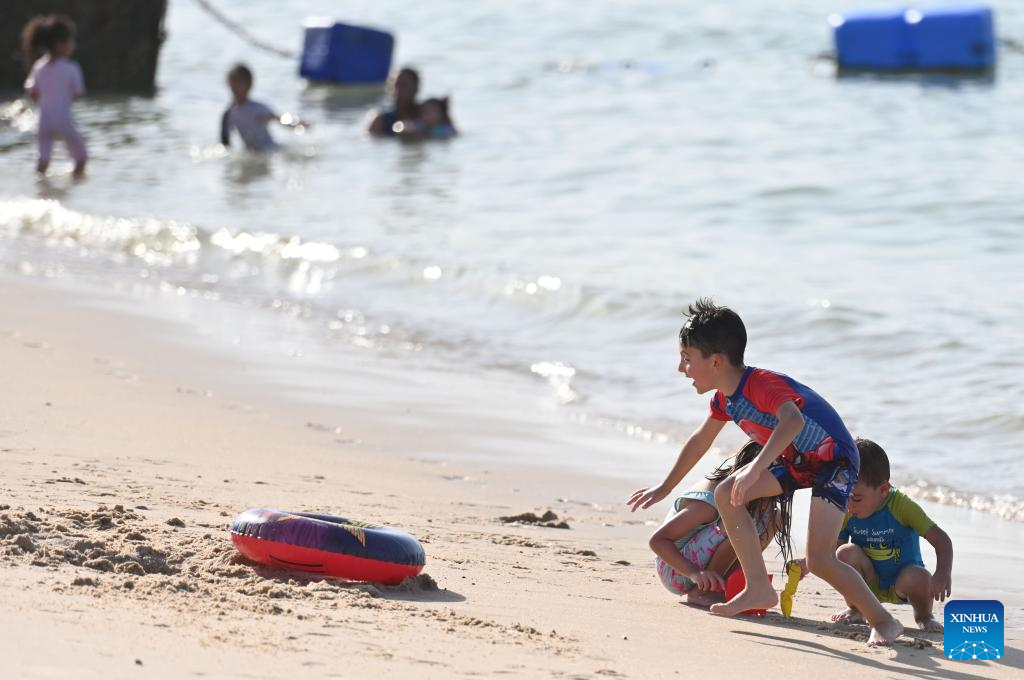 Children play on a beach during a heatwave in Hawalli Governorate, Kuwait, July 21, 2023. Many citizens in Kuwait enjoy their Islamic New Year holiday on a beach during a heatwave. The highest temperature reached 50 degrees centigrade on Friday, according to the Kuwait Meteorological Department. (Photo by Asad/Xinhua)