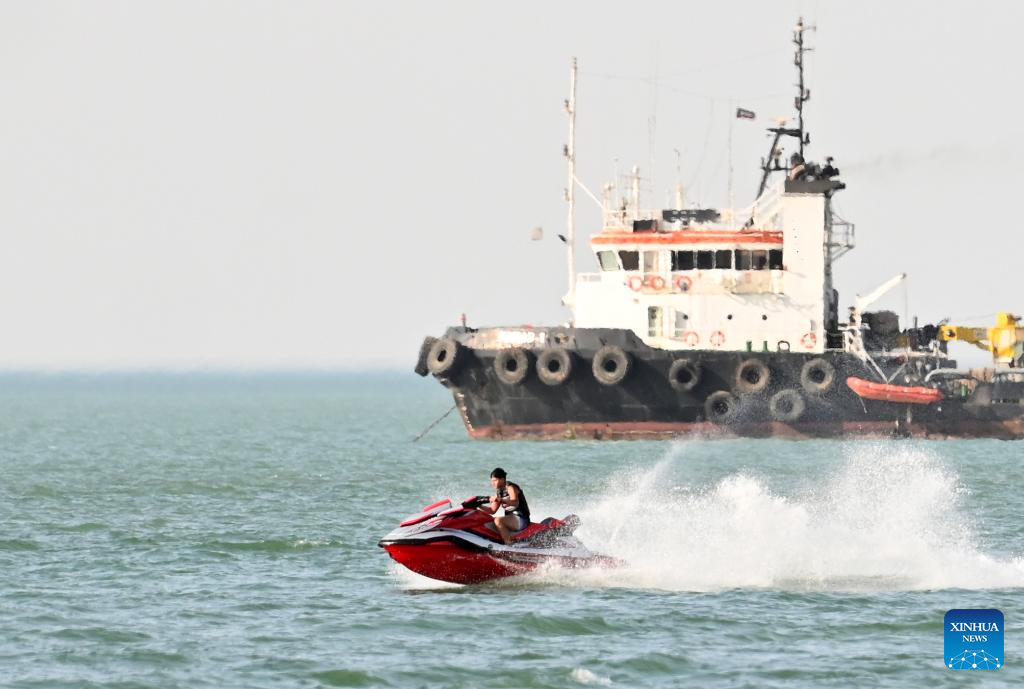 A young man rides a motorboat along the sea shore during a heatwave in Hawalli Governorate, Kuwait, July 21, 2023. Many citizens in Kuwait enjoy their Islamic New Year holiday on a beach during a heatwave. The highest temperature reached 50 degrees centigrade on Friday, according to the Kuwait Meteorological Department. (Photo by Asad/Xinhua)