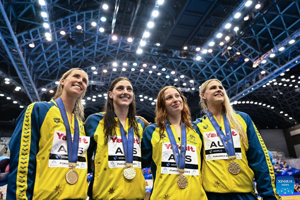 Gold medalists team Australia pose for photos after the women's 4x100m freestyle final at the World Aquatics Championships in Fukuoka, Japan, July 23, 2023. (Xinhua/Zhang Xiaoyu)