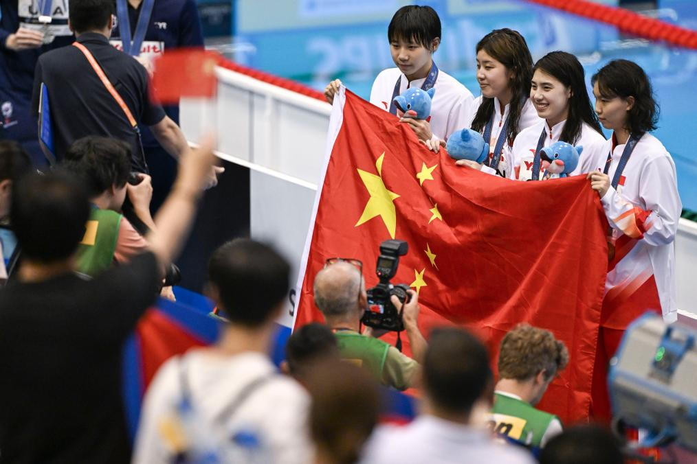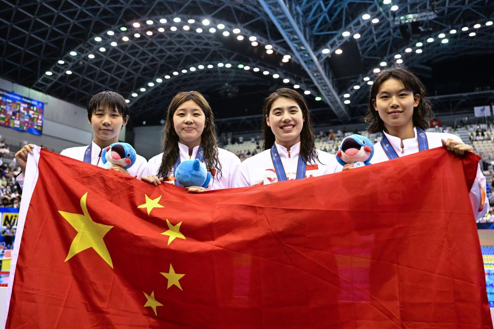 Yang Junxuan, Zhang Yufei, Wu Qingfeng and Cheng Yujie (R to L) of China pose for photos after the women's 4x100m freestyle final at the World Aquatics Championships in Fukuoka, Japan, July 23, 2023. (Xinhua/Xu Chang)