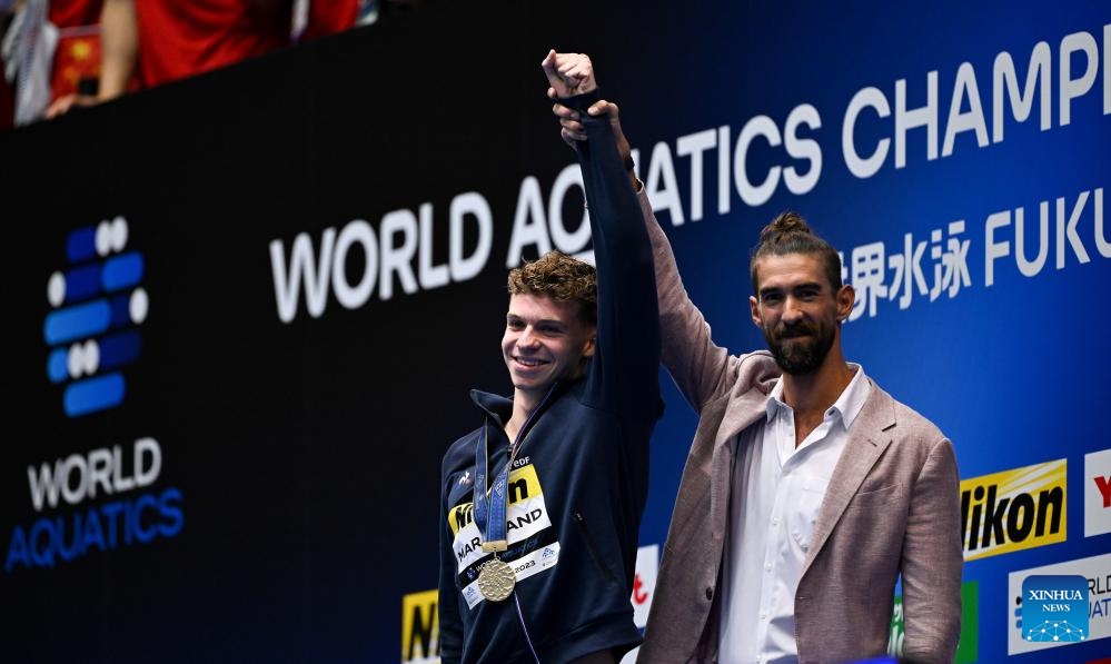 Gold medalist Leon Marchand (L) of France celebrates with Michael Phelps after the men's 400m medley final at the World Aquatics Championships in Fukuoka, Japan, July 23, 2023. (Xinhua/Xia Yifang)