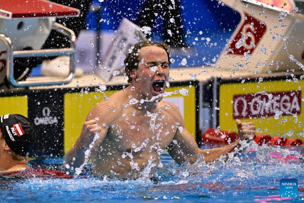 Samuel Short of Australia celebrates after the men's 400m freestyle final at the World Aquatics Championships in Fukuoka, Japan, July 23, 2023. (Xinhua/Zhang Xiaoyu)