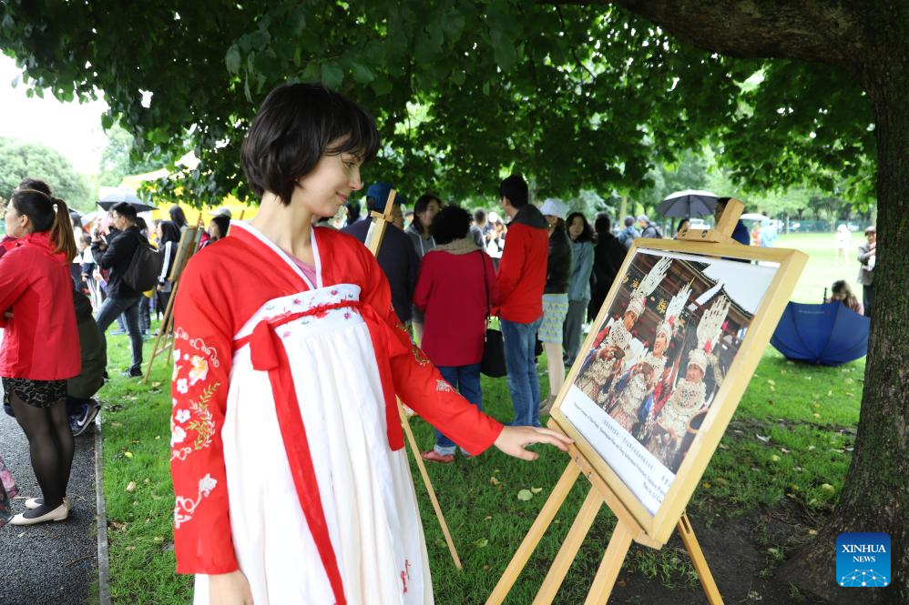 People view a photo exhibition during an event of "Chinese Culture in a Van" in Dublin, Ireland, July 23, 2023. The annual event designed to promote the Chinese culture in Ireland was held in Dublin on Sunday, drawing hundreds of local residents. (Photo by Liu Xiaoming/Xinhua)