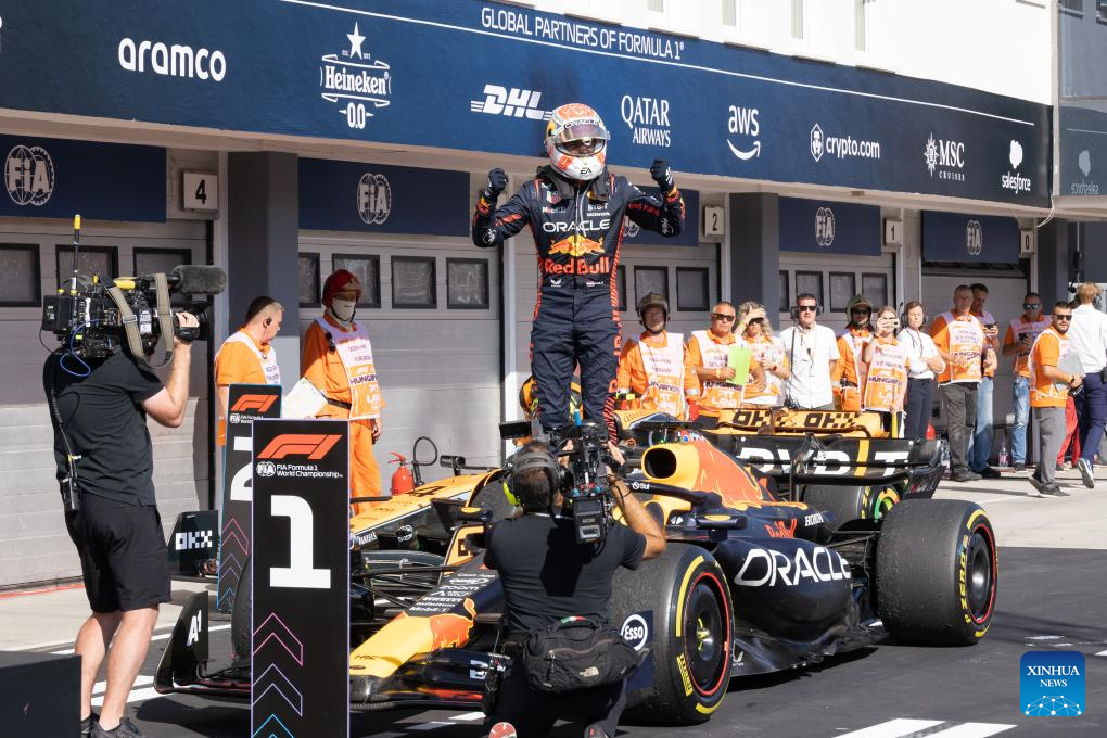 Red Bull Racing's Dutch driver Max Verstappen celebrates his victory after the Formula One Hungarian Grand Prix 2023 at Hungaroring in Mogyorod near Budapest, Hungary on July 23, 2023. (Photo by Attila Volgyi/Xinhua)