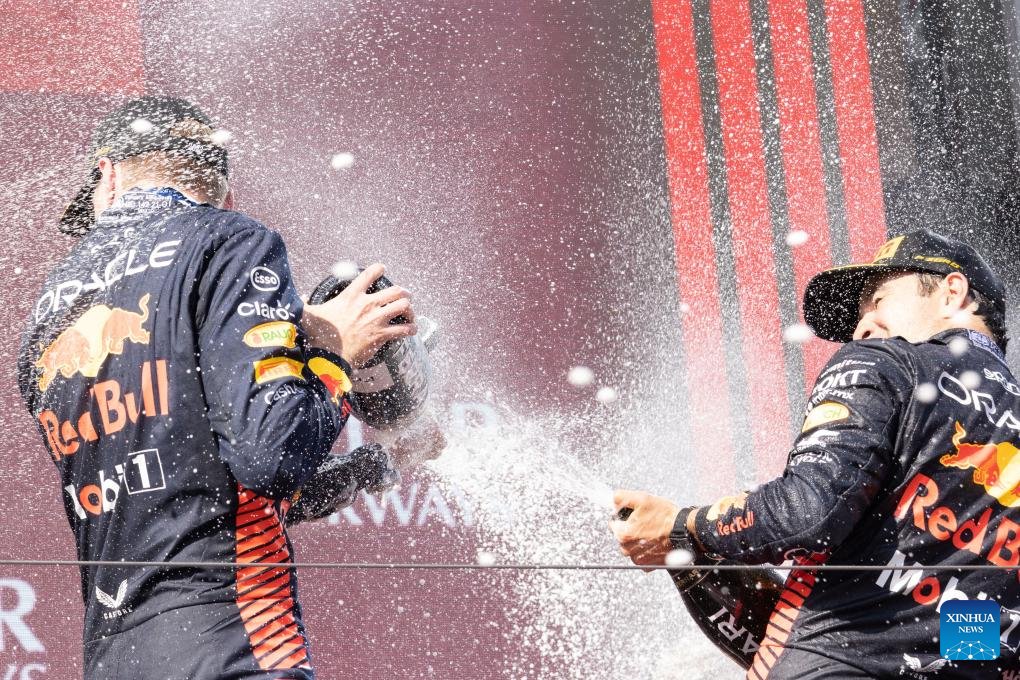 Red Bull Racing's Dutch driver Max Verstappen (L) and teammate Mexican driver Sergio Perez celebrate during the awarding ceremony after the Formula One Hungarian Grand Prix 2023 at Hungaroring in Mogyorod near Budapest, Hungary on July 23, 2023. (Photo by Attila Volgyi/Xinhua)