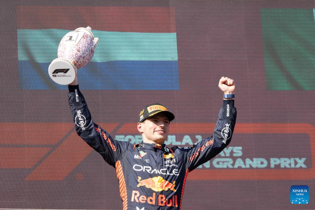 Red Bull Racing's Dutch driver Max Verstappen celebrates his victory during the awarding ceremony after the Formula One Hungarian Grand Prix 2023 at Hungaroring in Mogyorod near Budapest, Hungary on July 23, 2023. (Photo by Attila Volgyi/Xinhua)
