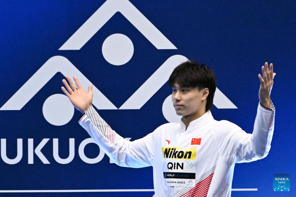 Gold medalist Qin Haiyang of China reacts during the awarding ceremony for men's 100m breaststroke at the World Aquatics Championships in Fukuoka, Japan, July 24, 2023. (Xinhua/Xu Chang)