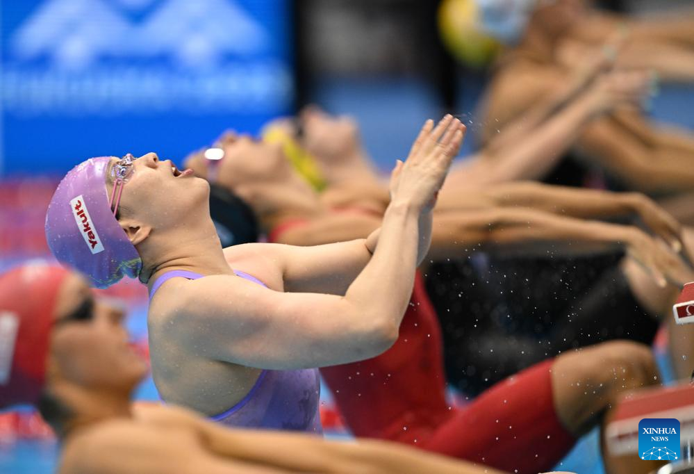 Zhang Yufei of China reacts after the women's 100m butterfly final at the World Aquatics Championships in Fukuoka, Japan, July 24, 2023. (Xinhua/Xu Chang)
