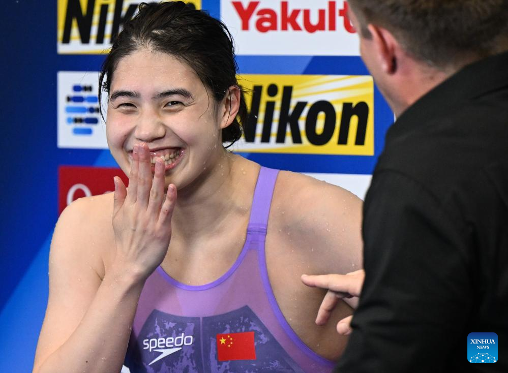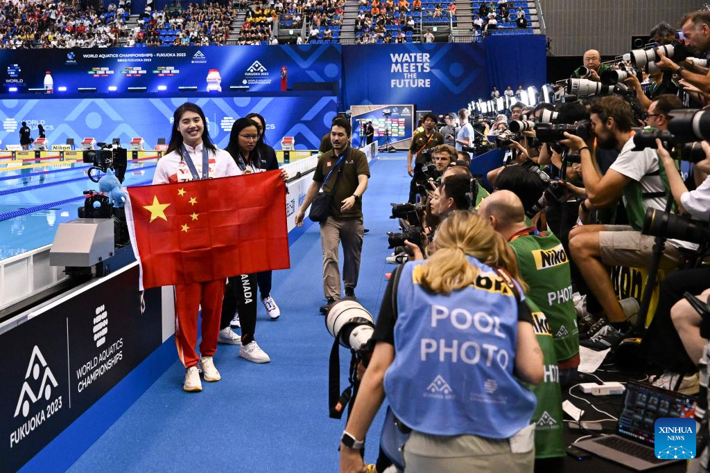 Gold medalist Zhang Yufei of China reacts after the awarding ceremony for women's 100m butterfly at the World Aquatics Championships in Fukuoka, Japan, July 24, 2023. (Xinhua/Xu Chang)