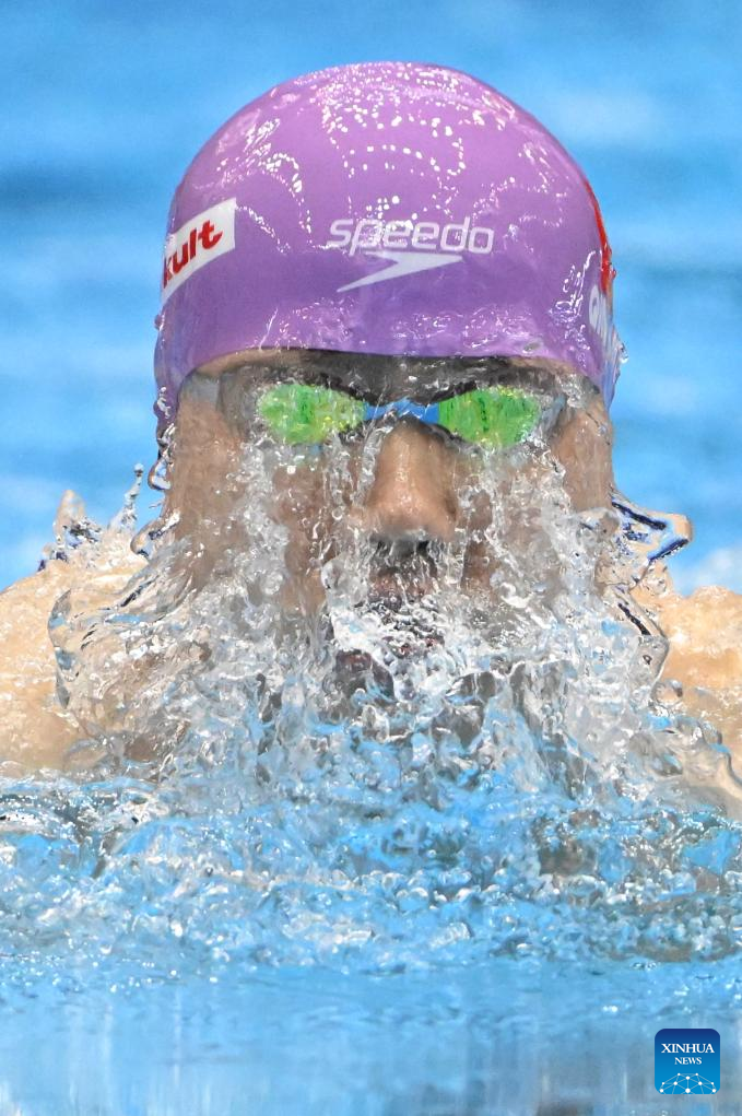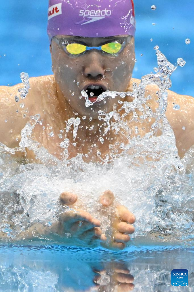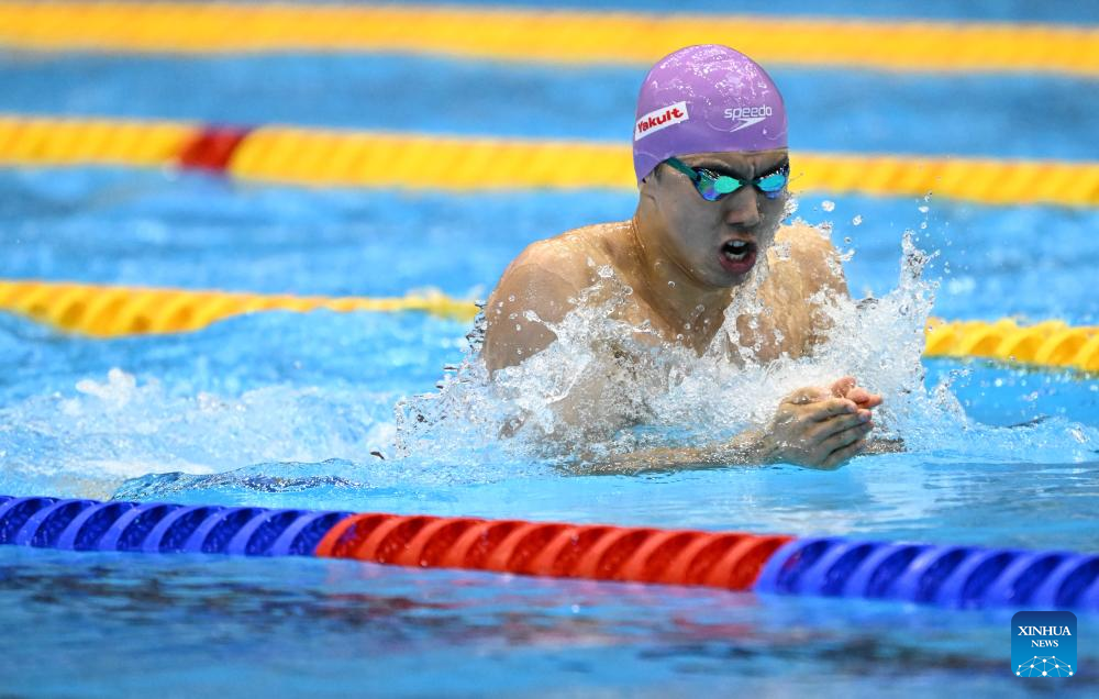Qin Haiyang of China competes during the men's 100m breaststroke final at the World Aquatics Championships in Fukuoka, Japan, July 24, 2023. (Xinhua/Xu Chang)