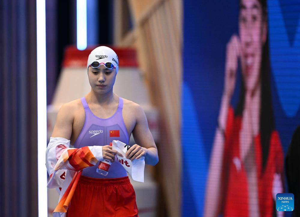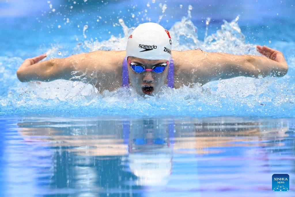 Only a few minutes later, Zhang, 200m butterfly gold winner at the Tokyo Olympics, earned China the second gold in swimming at the Fukuoka worlds in the women's 100m butterfly after clocking 56.12 seconds.
