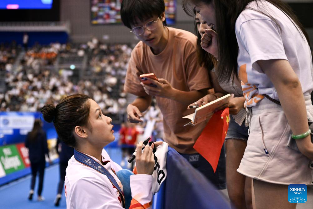 Bronze medalist Yu Yiting of China signs for fans after the awarding ceremony for women's 200m medley at the World Aquatics Championships in Fukuoka, Japan, July 24, 2023. (Xinhua/Xu Chang)