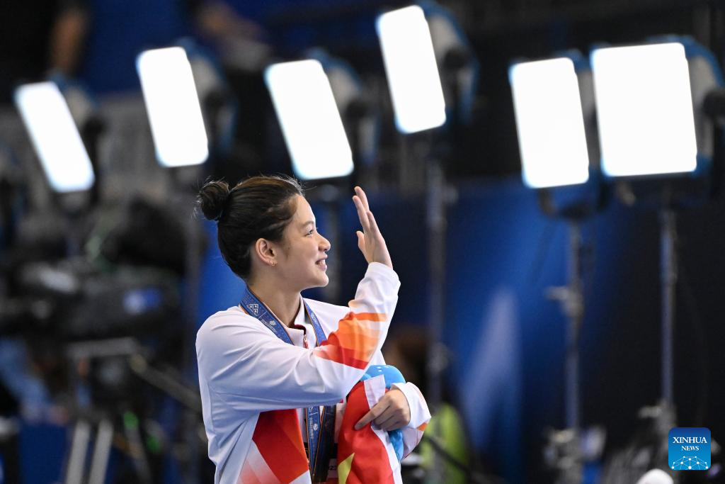 Bronze medalist Yu Yiting of China reacts after the awarding ceremony for women's 200m medley at the World Aquatics Championships in Fukuoka, Japan, July 24, 2023. (Xinhua/Xu Chang)