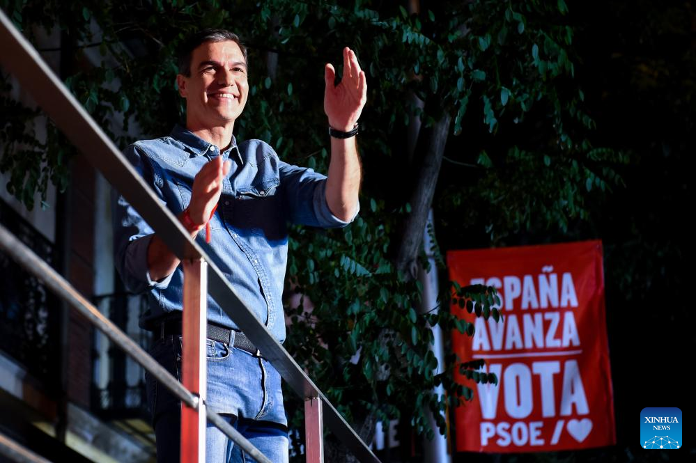 Pedro Sanchez, Spain's acting prime minister and Socialist Workers' Party (PSOE) leader, interacts with supporters in Madrid, Spain, July 23, 2023. Spain's opposition right-wing People's Party (PP) has won Sunday's general elections with 99.79 percent of the votes counted, while no single party garnered enough parliamentary seats to form a government.