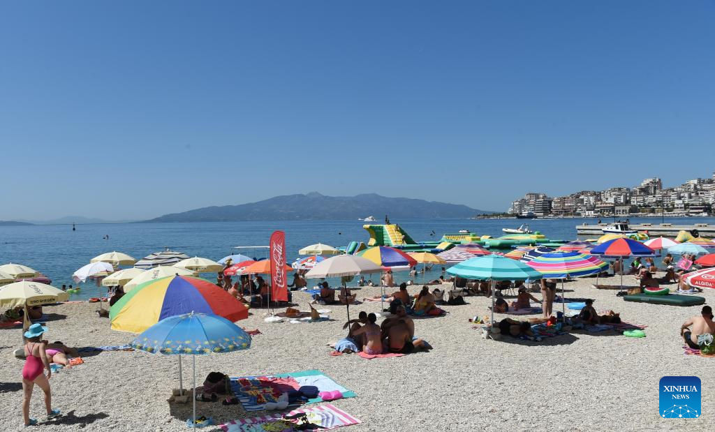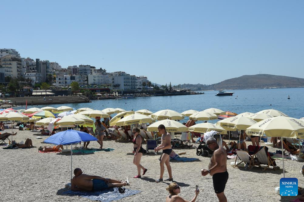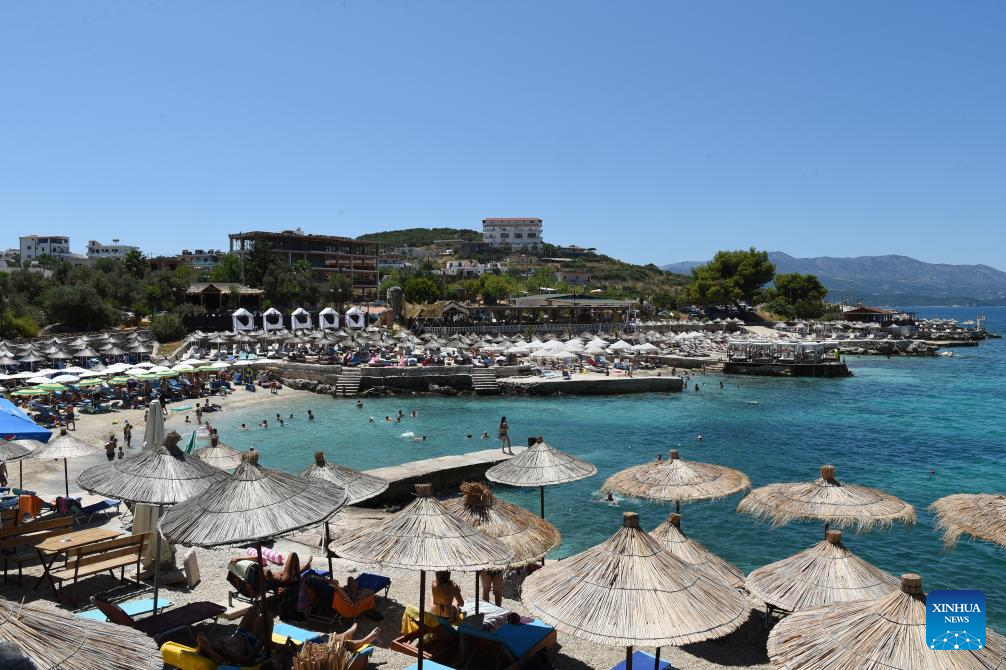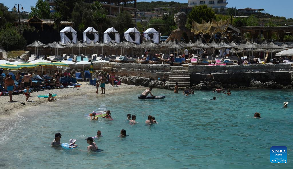 Tourists have fun at a beach in Sarande city, southern Albania, on July 30, 2023. In the first six months of 2023, 3,396,932 foreign nationals visited Albania, an increase of 33 percent year-on-year, the country's Institute of Statistics (INSTAT) said in a reported published on Wednesday. (Xinhua/Zhang Liyun)