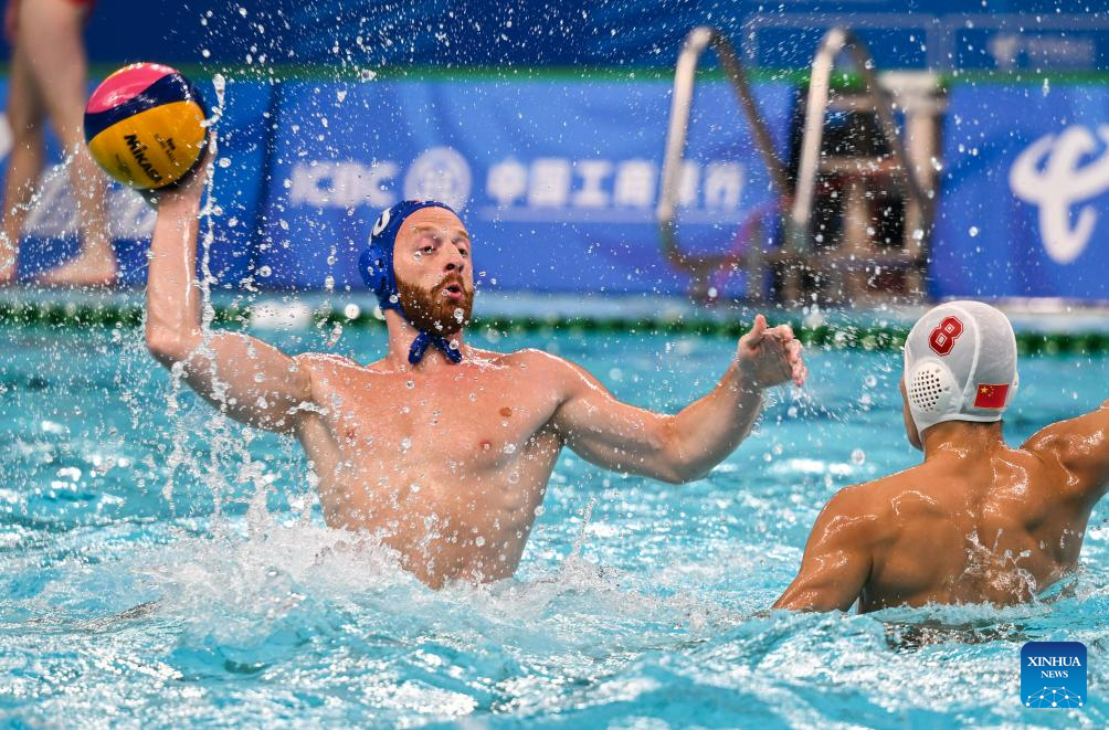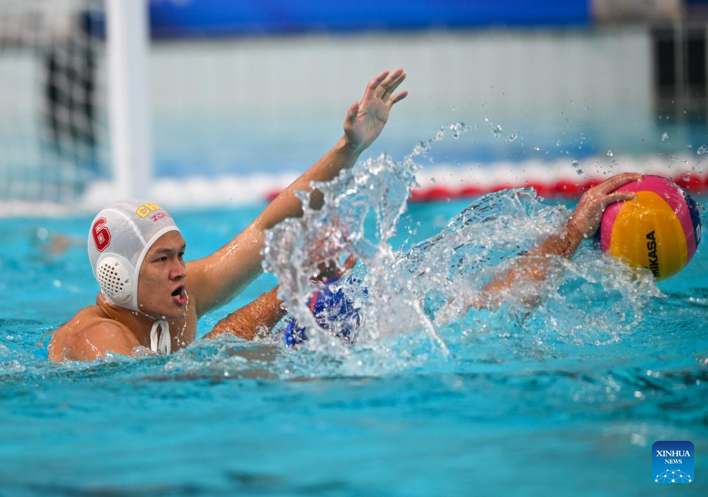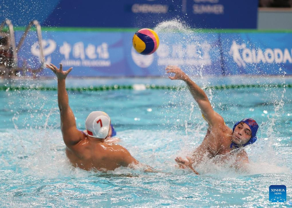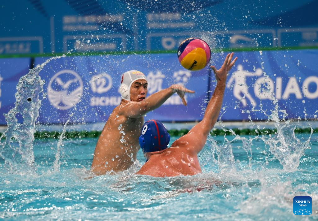 Zhu Beile (L) of China competes during the men's water polo group B match between China and Georgia at the 31st FISU Summer World University Games in Chengdu, southwest China's Sichuan Province, July 27, 2023. (Xinhua/Liu Lei)