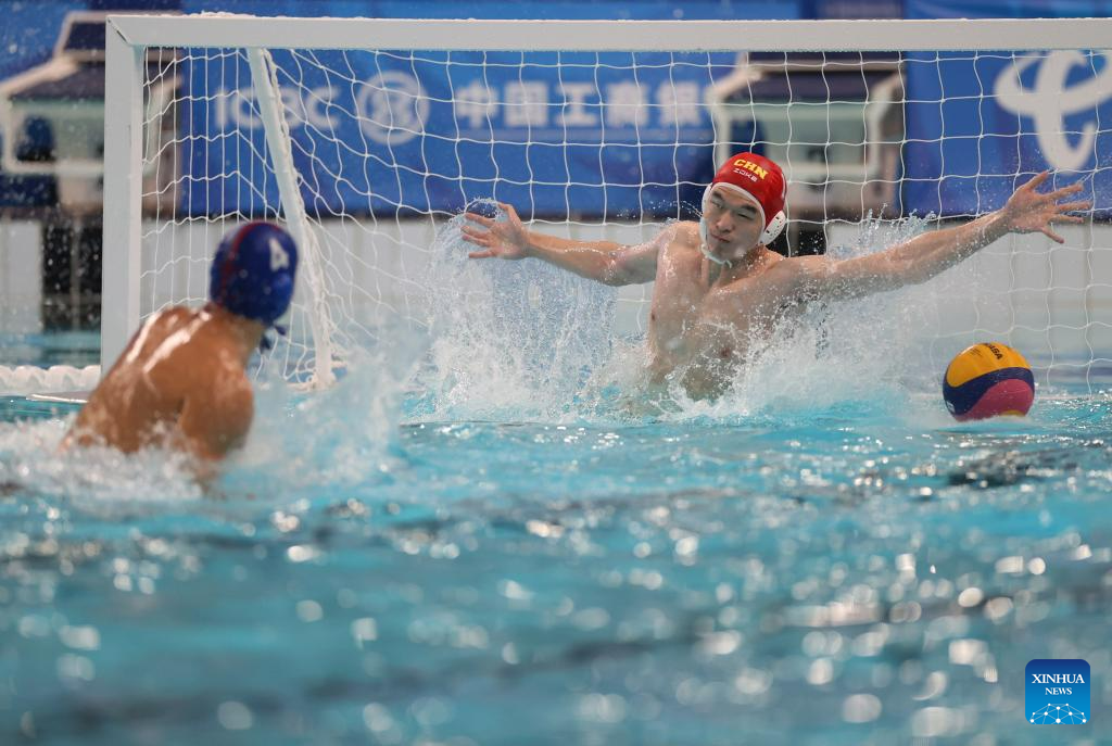 Goalkeeper Huang Yongbin (R) of China makes a save during the men's water polo group B match between China and Georgia at the 31st FISU Summer World University Games in Chengdu, southwest China's Sichuan Province, July 27, 2023. (Xinhua/Qi Xiaoyi)