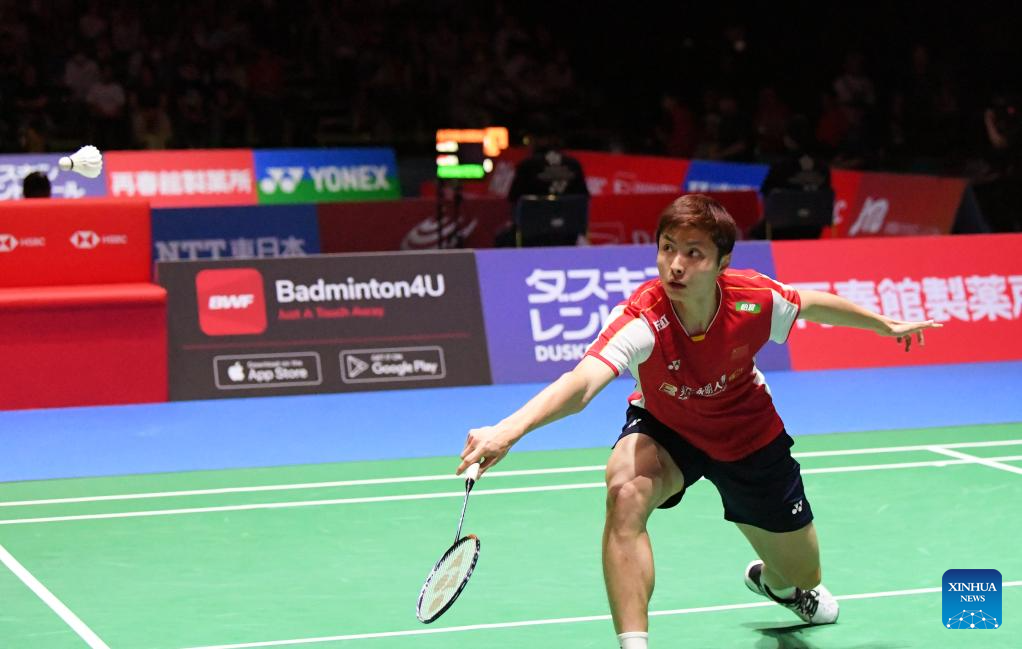Shi Yuqi of China competes during the men's singles quarterfinal match against Naraoka Kodai of Japan at the Japan Open Badminton Championships 2023 in Tokyo, Japan, July 28, 2023. (Xinhua/Yang Guang)