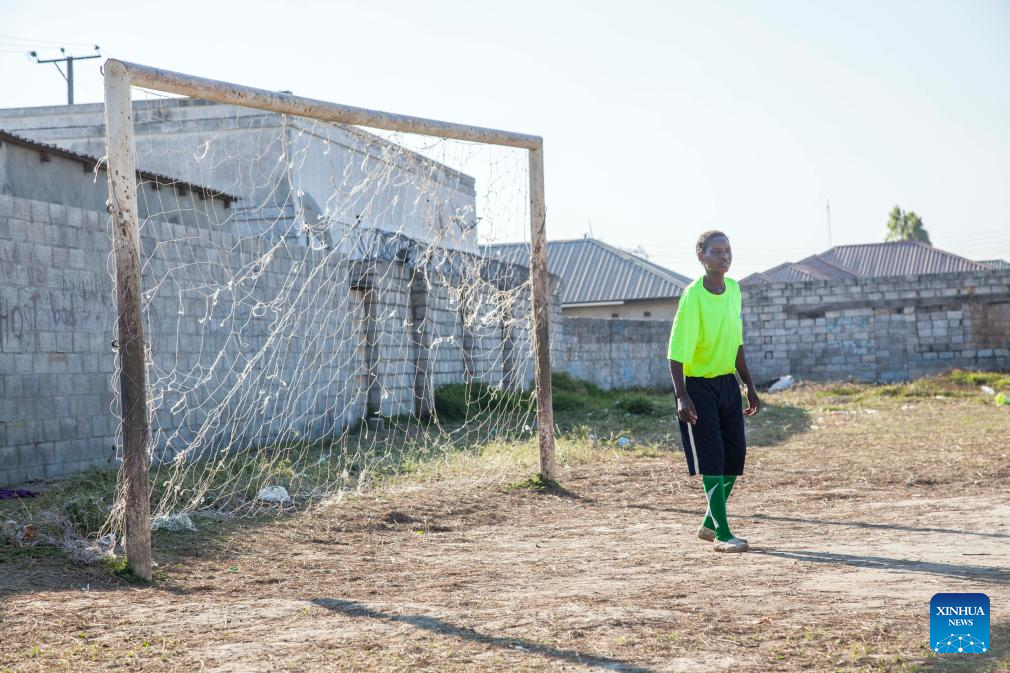 A goalkeeper of the Yasha Grannies football team takes part in a training in Lusaka, Zambia, July 27, 2023. (Photo by Martin Mbangweta/Xinhua)