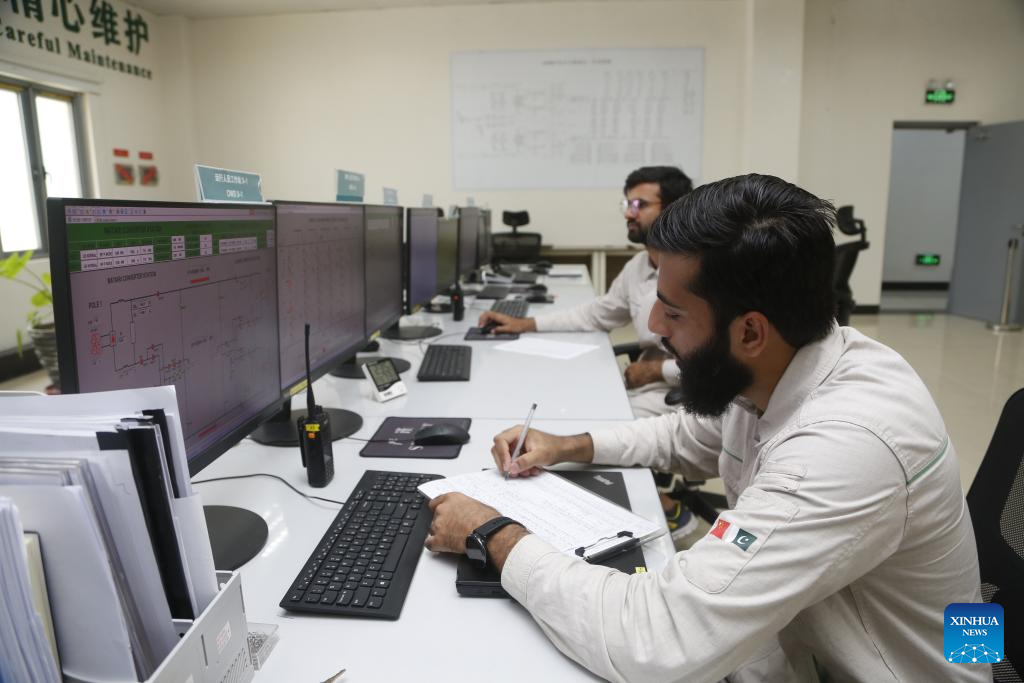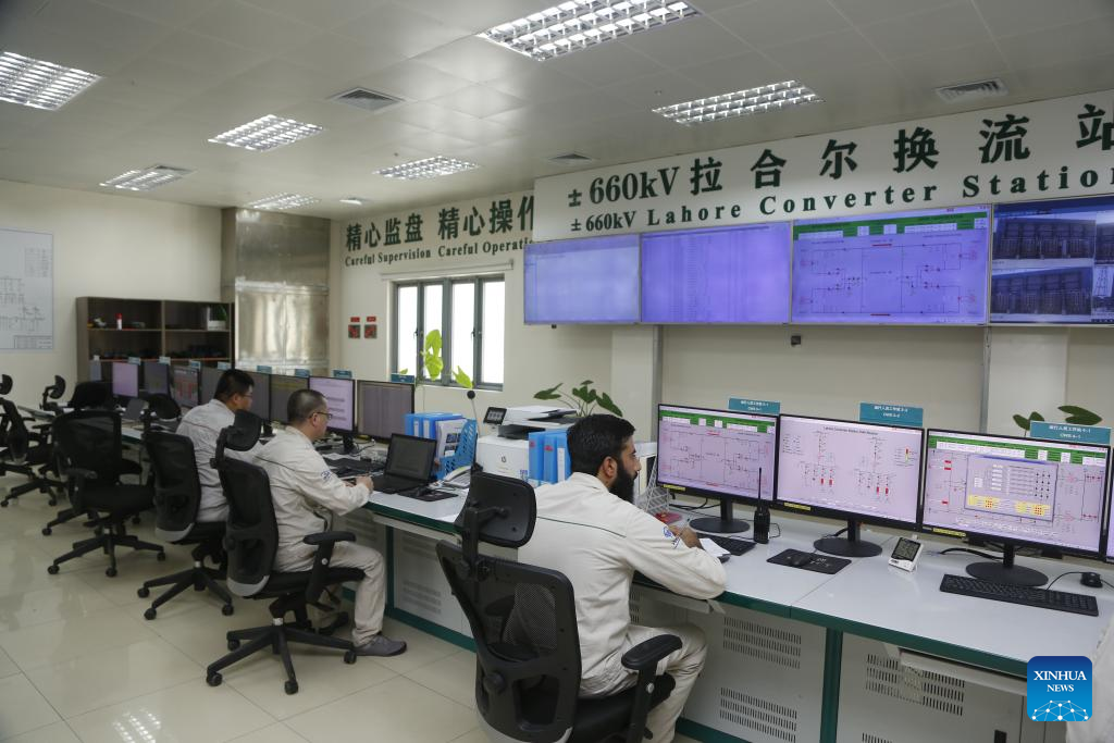 Zubair Tufail (R) works in the control room at a converter station of ±660 kilovolt Matiari-Lahore high-voltage direct current (HVDC) transmission project in a suburb of Lahore, Pakistan, July 4, 2023. (Xinhua/Ahmad Kamal)