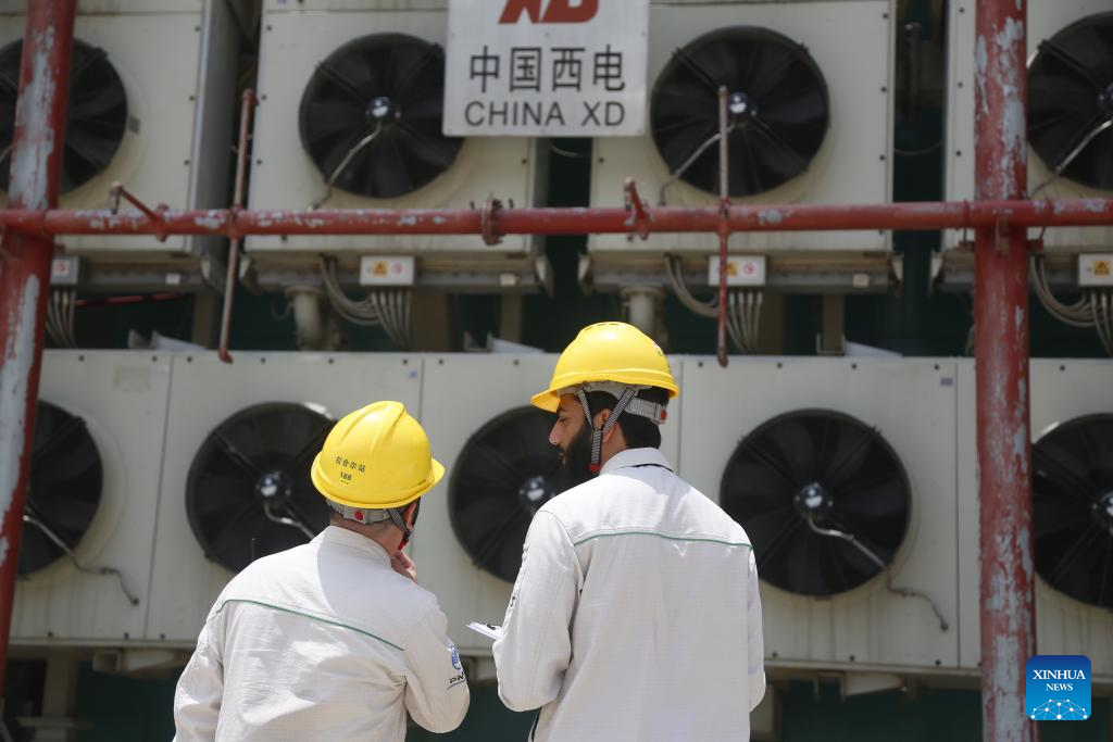 Zubair Tufail and his Chinese counterpart Li Shoujin (L) check converter transformers at a converter station of ±660 kilovolt Matiari-Lahore high-voltage direct current (HVDC) transmission project in a suburb of Lahore, Pakistan, July 4, 2023. (Xinhua/Ahmad Kamal)