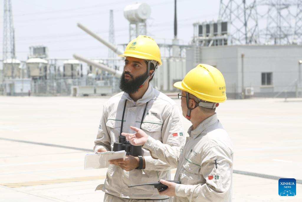 Zubair Tufail and his Chinese counterpart Li Shoujin (R) patrol at a converter station of ±660 kilovolt Matiari-Lahore high-voltage direct current (HVDC) transmission project in a suburb of Lahore, Pakistan, July 4, 2023. (Xinhua/Ahmad Kamal)