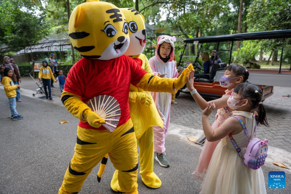 Performers in tiger-figured costumes interact with visitors at Zoo Negara, the national zoo of Malaysia, in Kuala Lumpur, Malaysia, on July 29, 2023. The International Tiger Day is marked on July 29 every year. (Photo by Chong Voon Chung/Xinhua)
