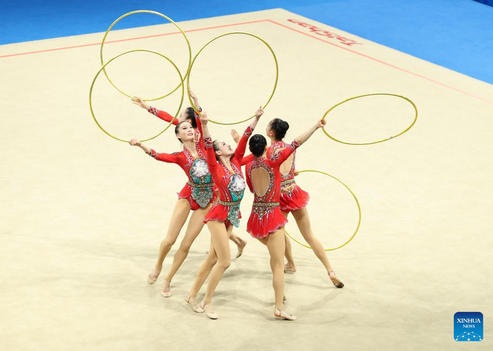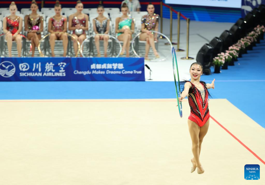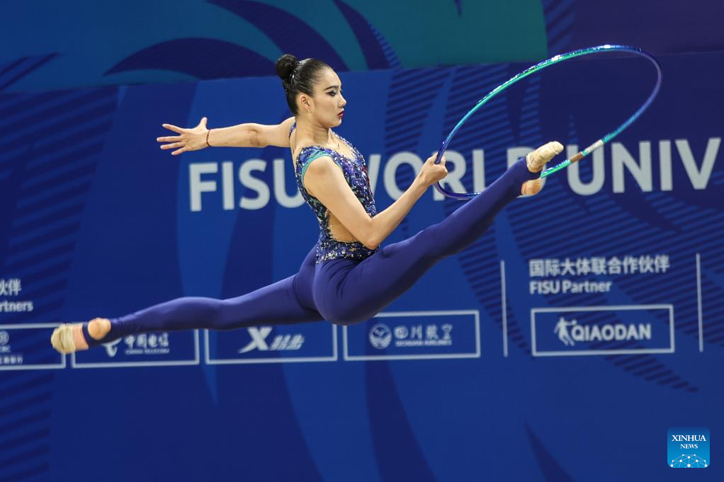 Li Huilin of China competes during the Group B Rotation 1 of Individual All-Around Final of Rhythmic Gymnastics at the 31st FISU Summer World University Games in Chengdu, southwest China's Sichuan Province, July 29, 2023. (Xinhua/Zhang Liyun)