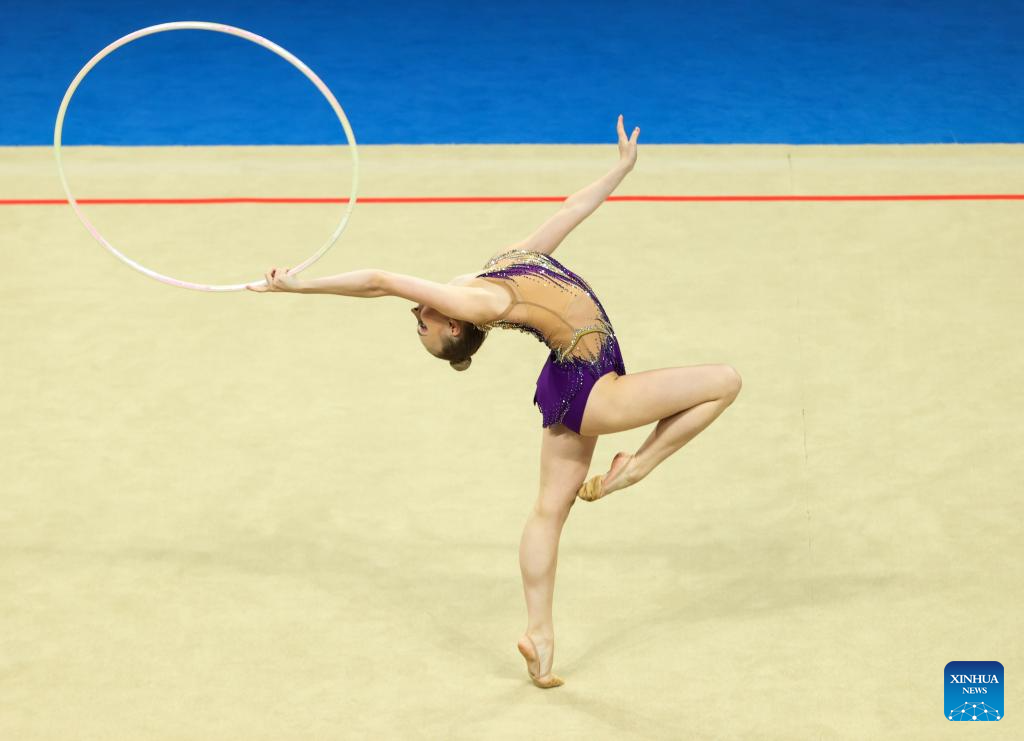 Adelina Beljajeva of Estonia competes during the Group A Rotation 1 of Individual All-Around Final of Rhythmic Gymnastics at the 31st FISU Summer World University Games in Chengdu, southwest China's Sichuan Province, July 29, 2023. (Xinhua/Wang Jingqiang)