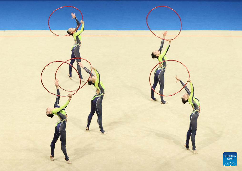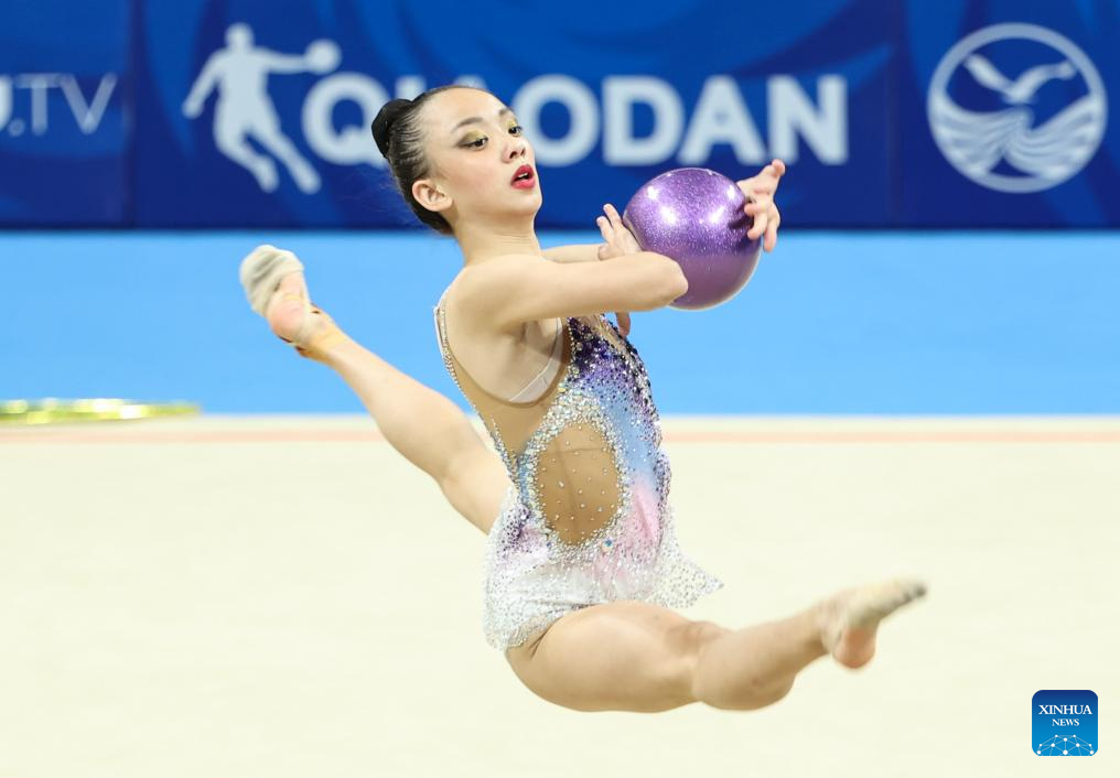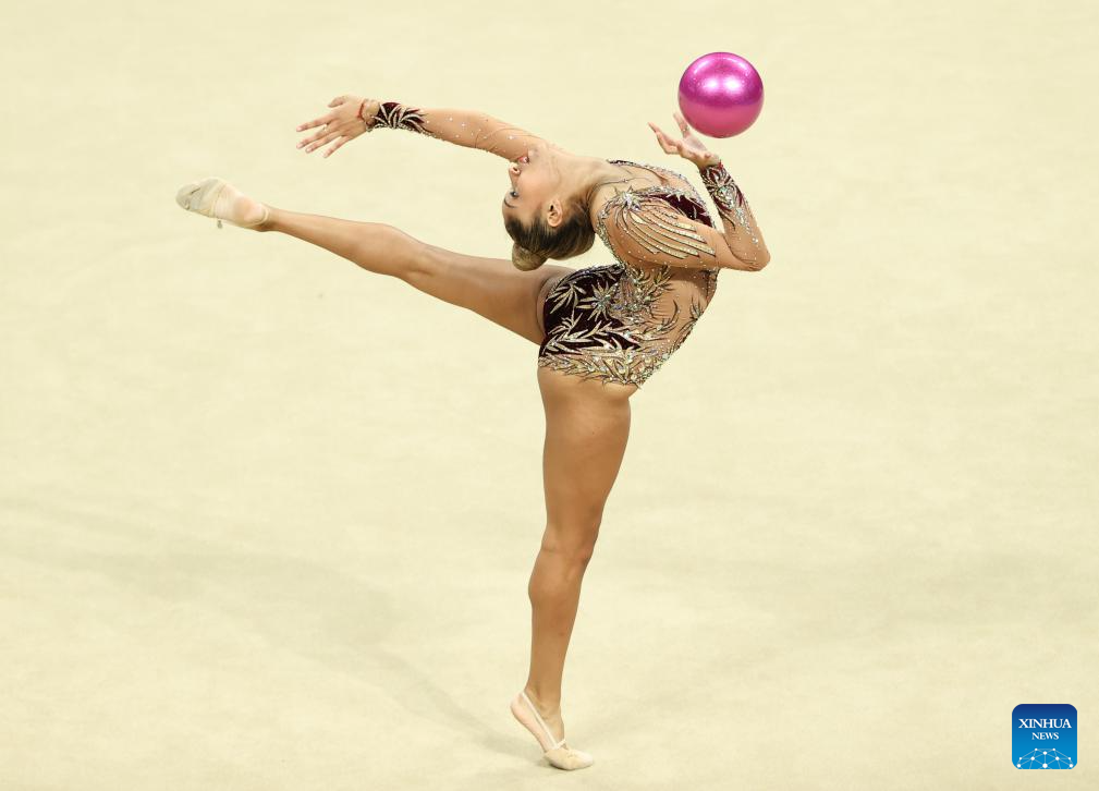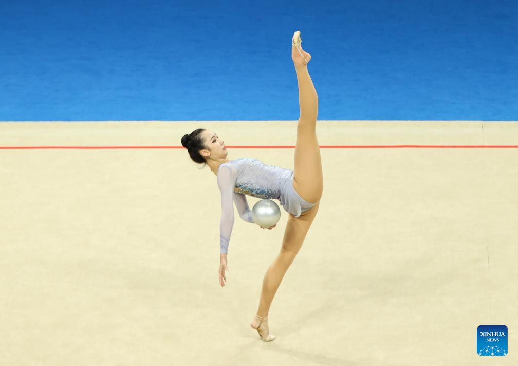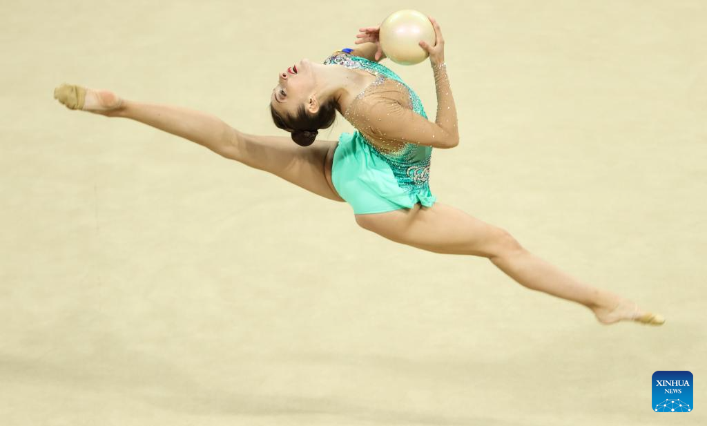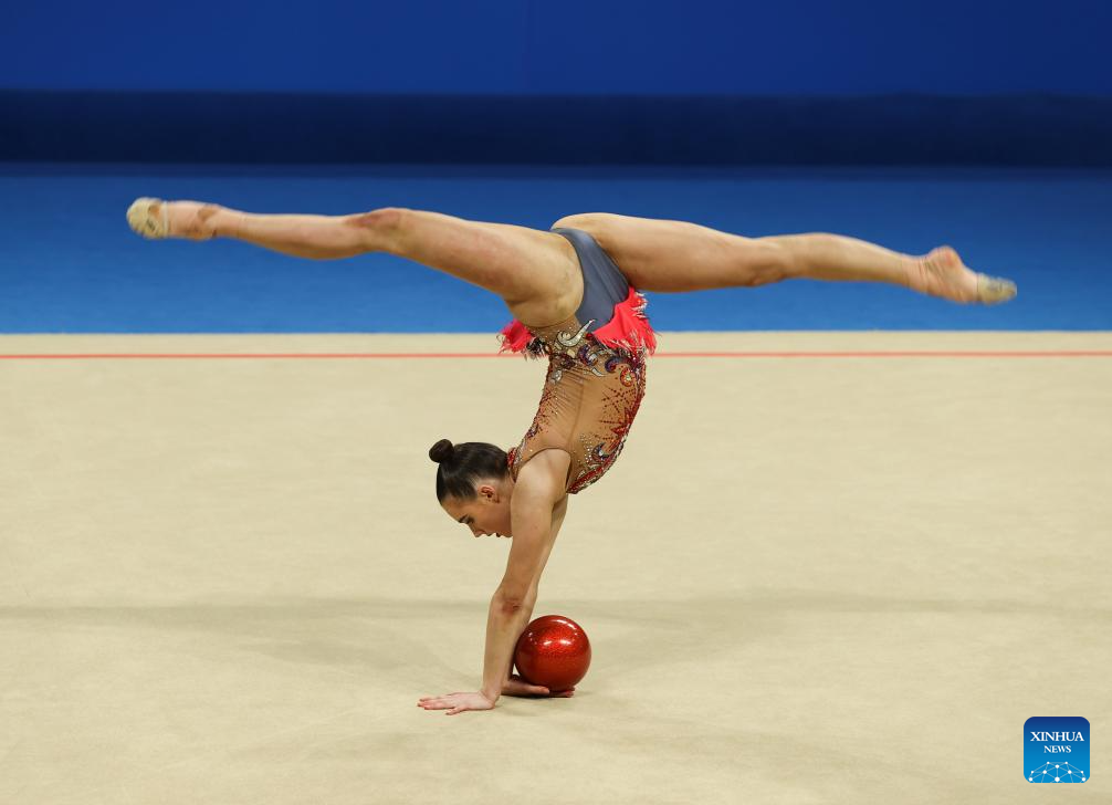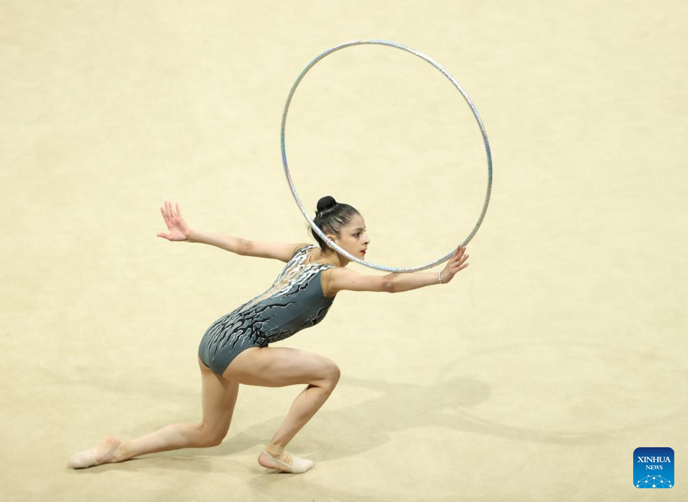 Ilona Zeynalova of Azerbaijan competes during the Group A Rotation 1 of Individual All-Around Final of Rhythmic Gymnastics at the 31st FISU Summer World University Games in Chengdu, southwest China's Sichuan Province, July 29, 2023. (Xinhua/Wang Jingqiang)