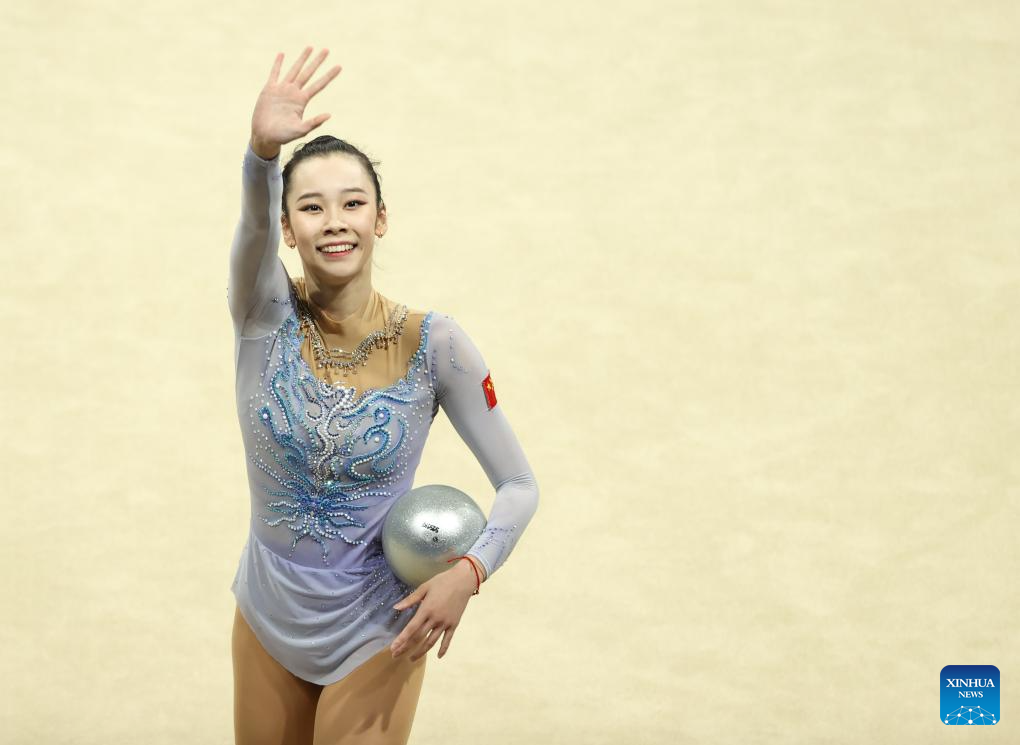 Zhao Yue of China waves to spectators after her performance during the Group A Rotation 1 of Individual All-Around Final of Rhythmic Gymnastics at the 31st FISU Summer World University Games in Chengdu, southwest China's Sichuan Province, July 29, 2023. (Xinhua/Wang Jingqiang)