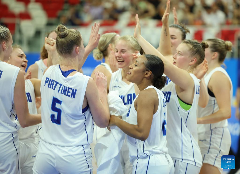 Players of Finland celebrate after the basketball women's preliminary round group C match between Finland and Romania at the 31st FISU Summer World University Games in Chengdu, southwest China's Sichuan Province, July 29, 2023. (Xinhua/Yang Qing)
