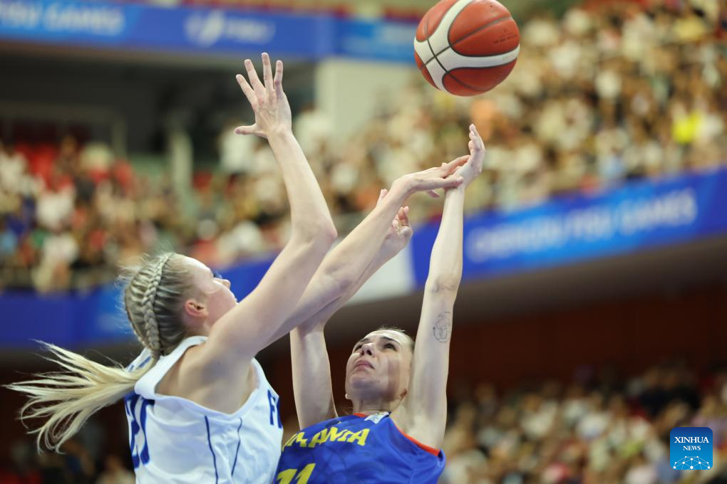 Lotta-maj wilhelmiina Lahtinen (L) of Finland vie swith Bianca Nan of Romania during the basketball women's preliminary round group C match between Finland and Romania at the 31st FISU Summer World University Games in Chengdu, southwest China's Sichuan Province, July 29, 2023. (Xinhua/Yang Qing)