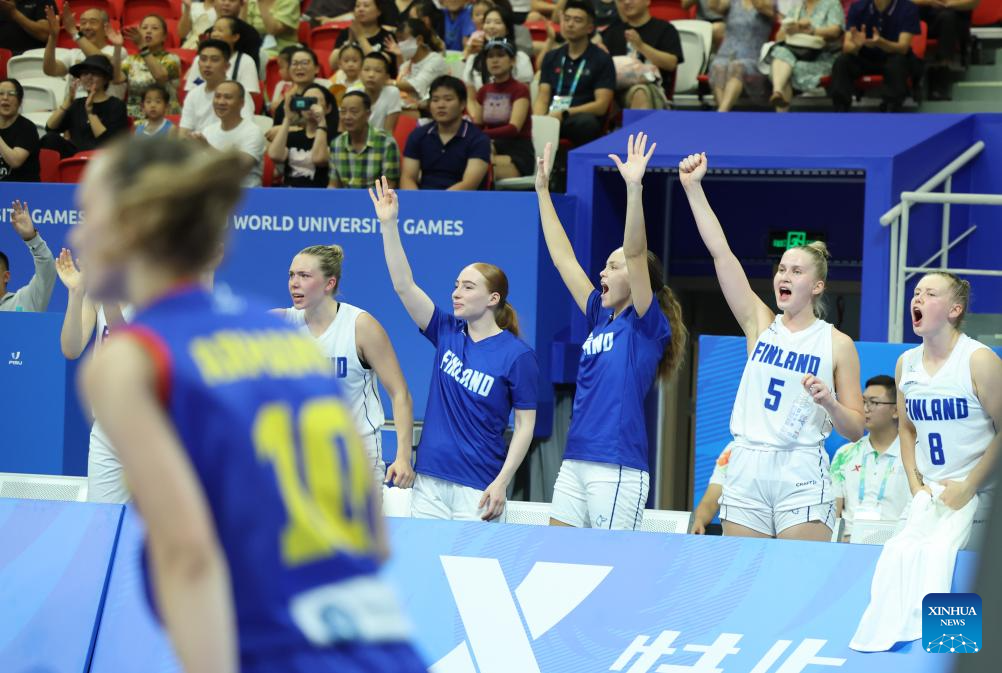 Players of Finland celebrate scoring during the basketball women's preliminary round group C match between Finland and Romania at the 31st FISU Summer World University Games in Chengdu, southwest China's Sichuan Province, July 29, 2023. (Xinhua/Yang Qing)