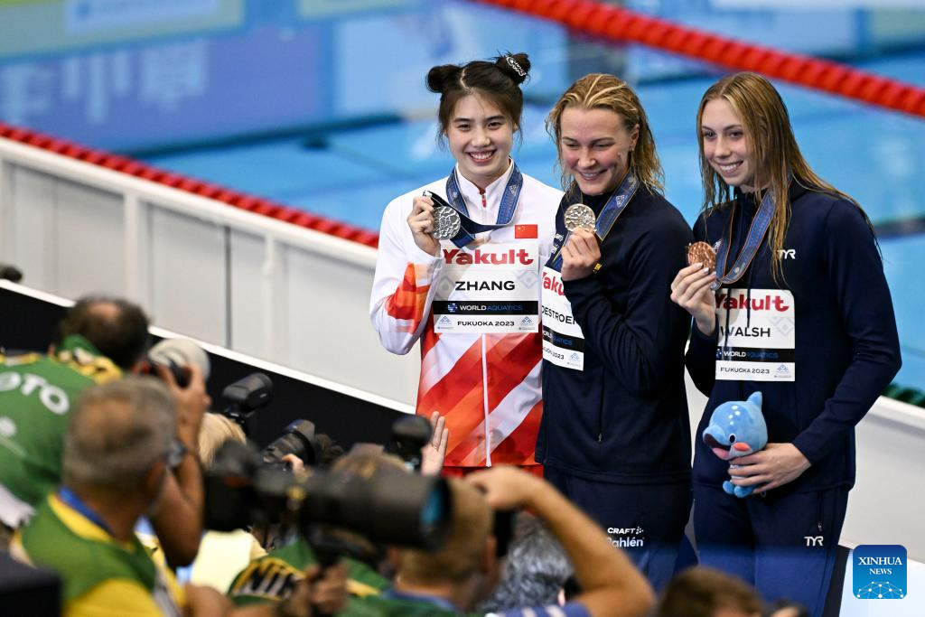 Silver medalist China's Zhang Yufei, gold medalist Sweden's Sarah Sjoestroem and bronze medalist USA's Gretchen Walsh (L to R) pose during the medals ceremony for the women's 50m butterfly final of swimming at the World Aquatics Championships in Fukuoka, Japan, July 29, 2023. (Xinhua/Xu Chang)