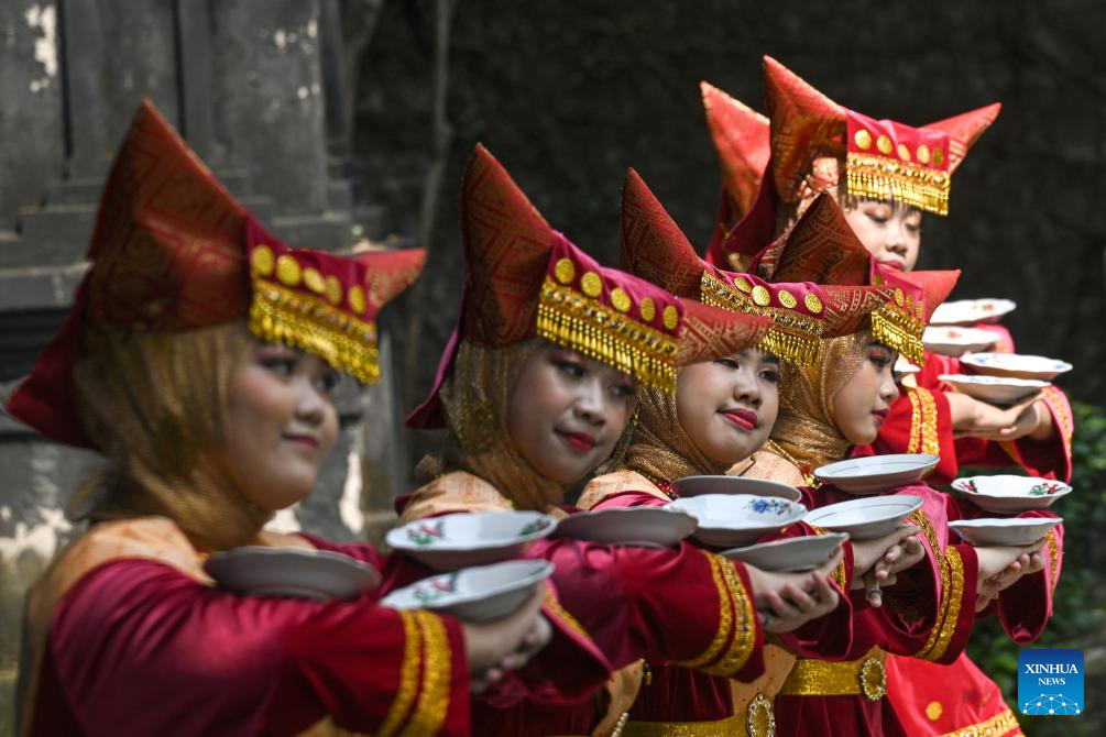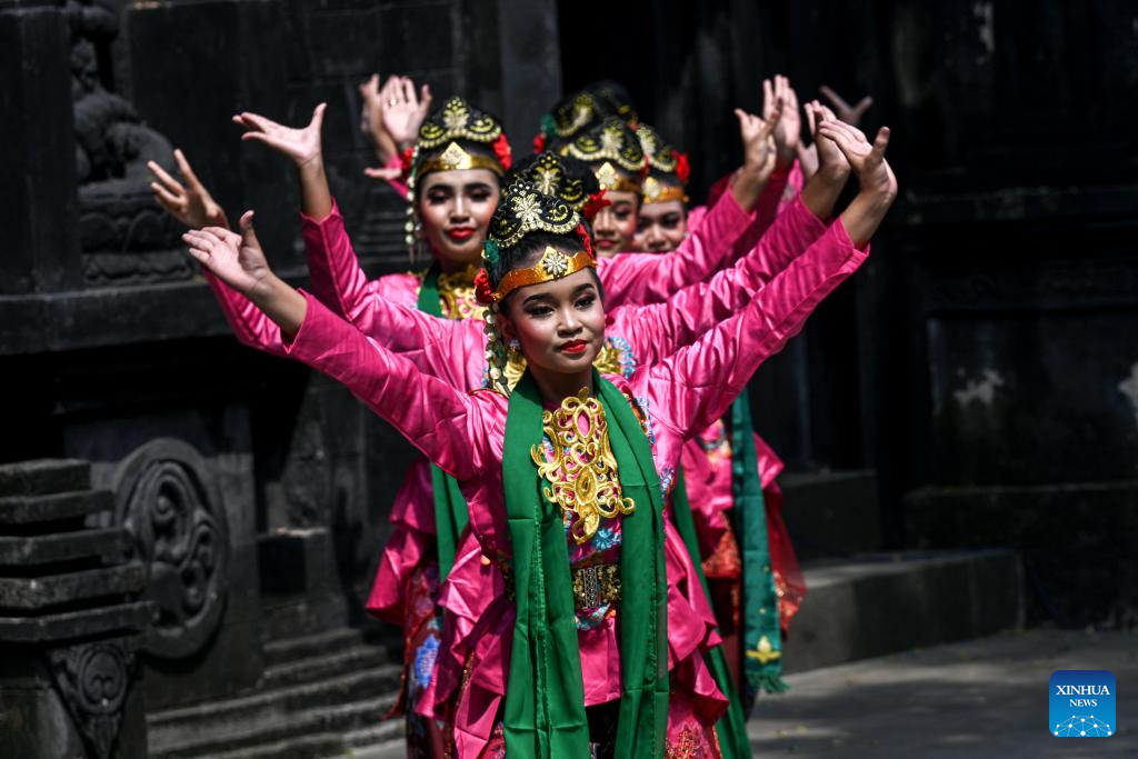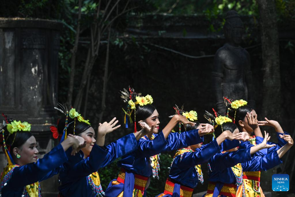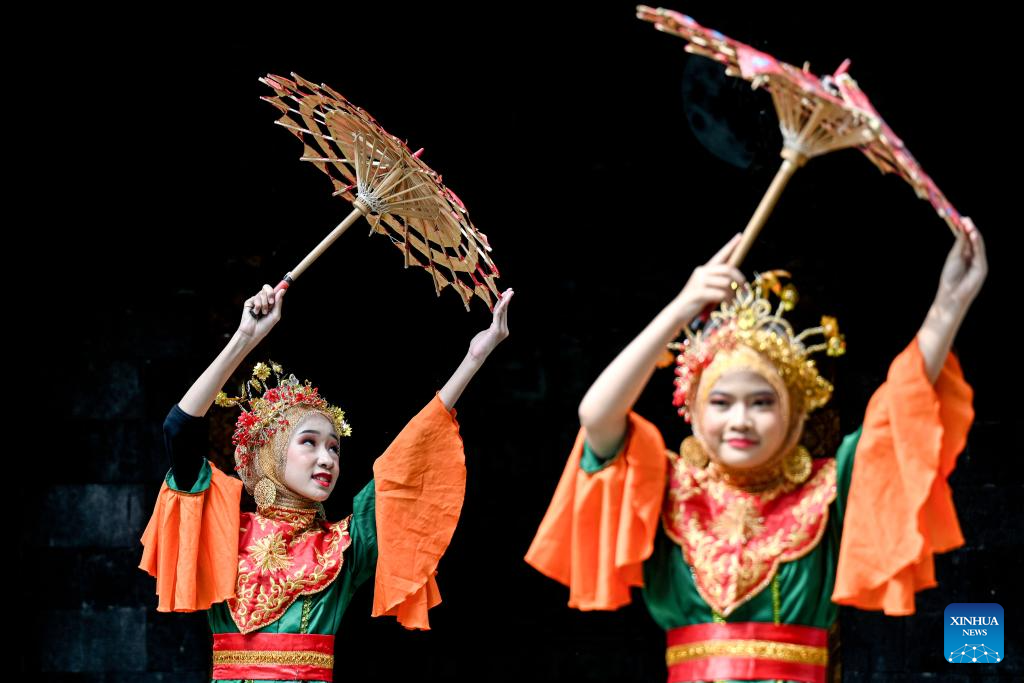 Dancers perform Indonesian traditional dance during Lomba Tari Nusantara at Rumah Budaya Nusantara Puspo Budoyo in South Tangerang, Banten Province, Indonesia, on July 29, 2023. Lomba Tari Nusantara is held to preserve the Indonesian traditional dance among teenagers. (Xinhua/Agung Kuncahya B.)