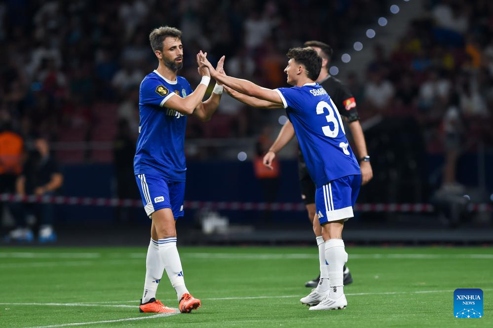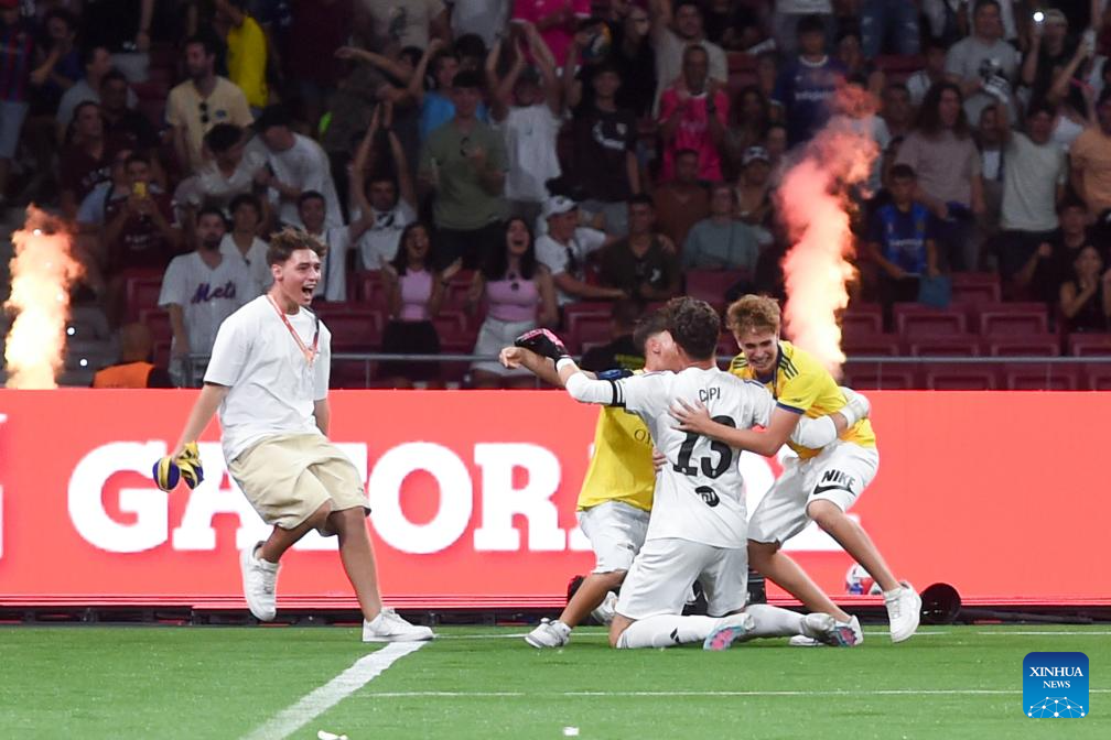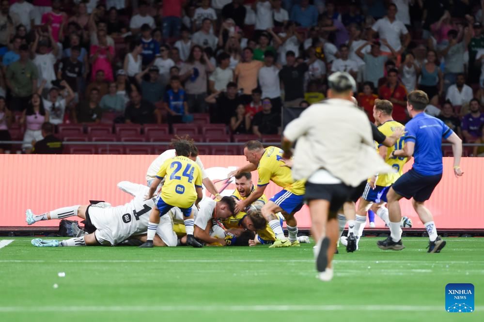 Players of xBuyer Team celebrate a goal during the King's League final between El Barrio and xBuyer Team at Civitas Metropolitano Stadium in Madrid, Spain, July 29, 2023. (Photo by Gustavo Valiente/Xinhua)