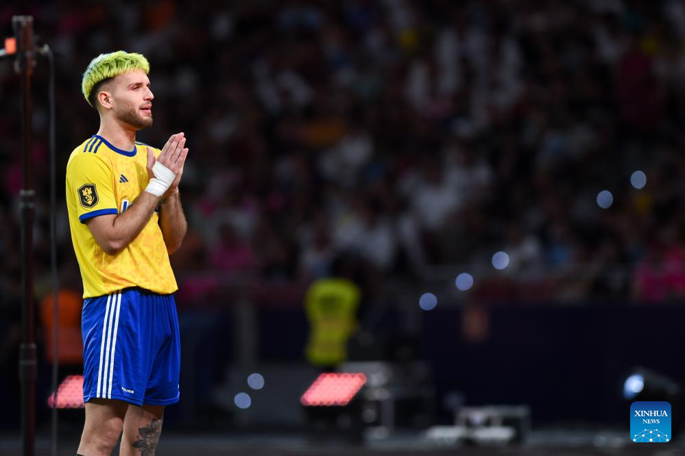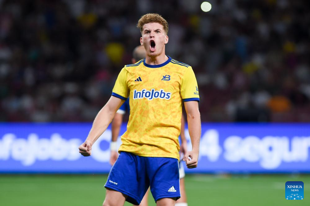 Antoni of xBuyer Team celebrates a goal during the King's League final between El Barrio and xBuyer Team at Civitas Metropolitano Stadium in Madrid, Spain, July 29, 2023. (Photo by Gustavo Valiente/Xinhua)