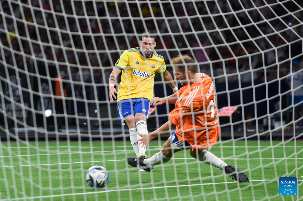 Fernando Velillas (L) of xBuyer Team scores a goal during the King's League final between El Barrio and xBuyer Team at Civitas Metropolitano Stadium in Madrid, Spain, July 29, 2023. (Photo by Gustavo Valiente/Xinhua)