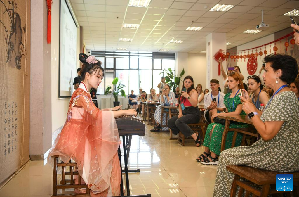 Foreign dance troupe members watch a performance of guzheng, a Chinese zither, at the Xinjiang Library in Urumqi, northwest China's Xinjiang Uygur Autonomous Region, on July 23, 2023.