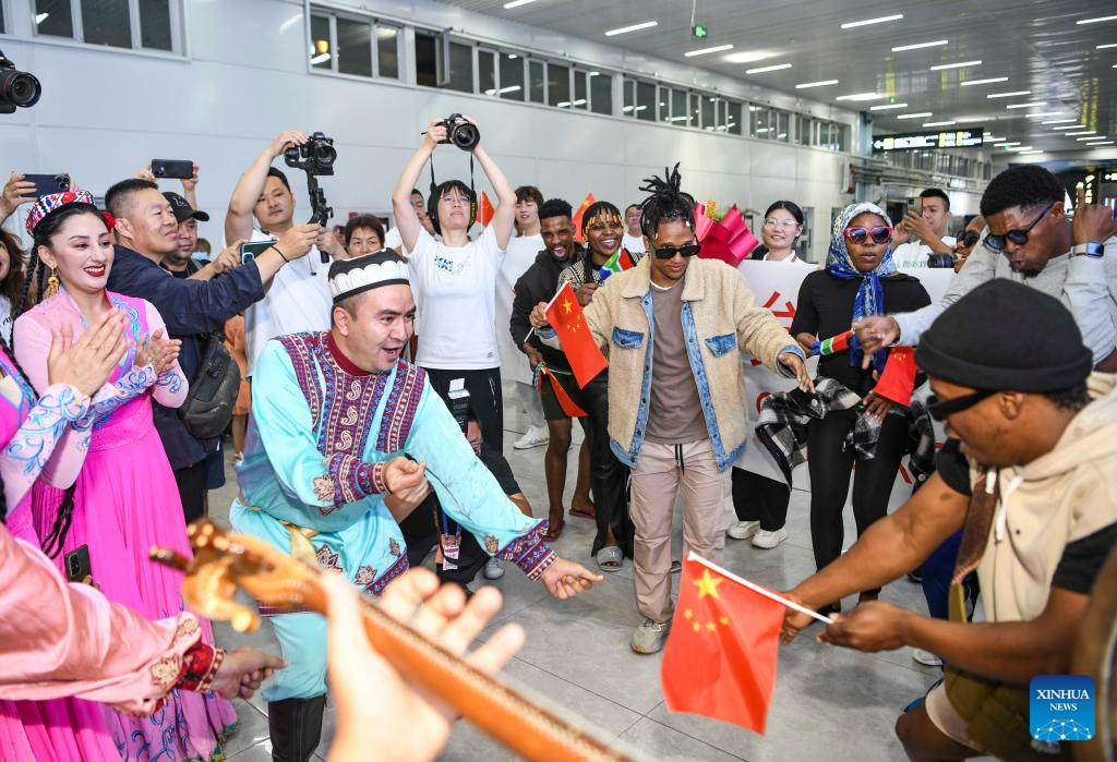 Members of the Muqam Art Troupe of Xinjiang Art Theater dance to welcome a South African dance troupe at the Urumqi Diwopu International Airport in Urumqi, northwest China's Xinjiang Uygur Autonomous Region, July 24, 2023.