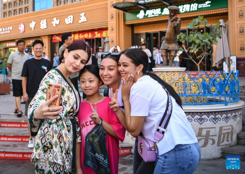 Three dancers from Uzbekistan take a selfie with a tourist (2nd L, front) at the International Grand Bazaar in Urumqi, northwest China's Xinjiang Uygur Autonomous Region, July 25, 2023.