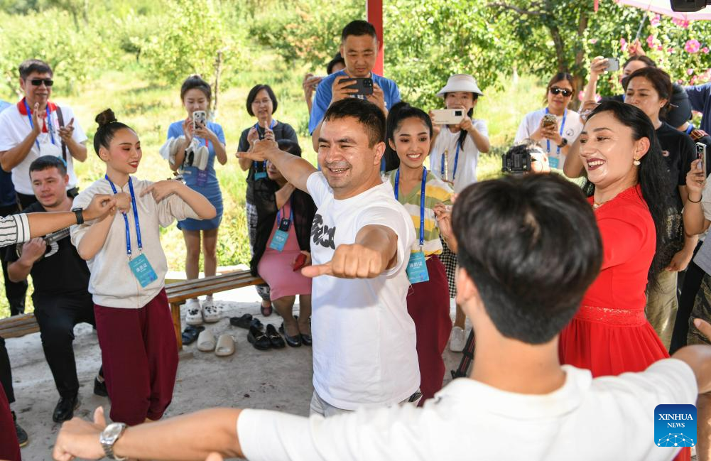 Dance troupe members from the Bunditpatanasilpa Institute of Thailand and members of the Muqam Art Troupe of Xinjiang Art Theater dance together at the Xinjiang Art Theater in Urumqi, northwest China's Xinjiang Uygur Autonomous Region, July 24, 2023.