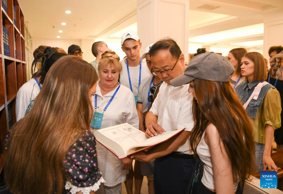 A staff member (2nd R, front) introduces the Yongle Canon, the world's earliest and biggest encyclopedia compiled in the early 1400s, to foreign dance troupe members visiting the Xinjiang Library in Urumqi, northwest China's Xinjiang Uygur Autonomous Region, on July 23, 2023.