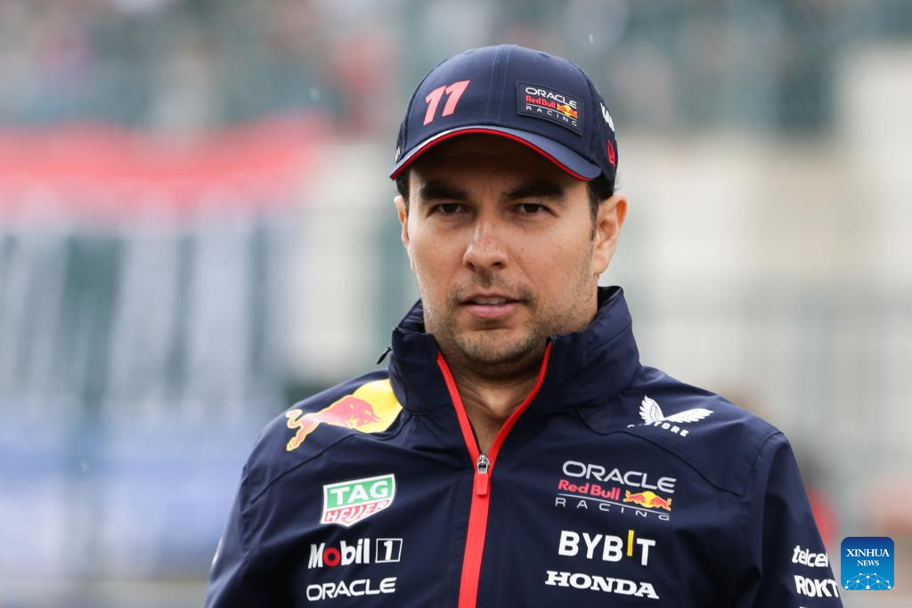 Red Bull Racing's Mexican driver Sergio Perez reacts during a parade before the Race of the Formula 1 Belgian Grand Prix 2023 at the Circuit of Spa-Francorchamps, Stavelot, Belgium, July 30, 2023. (Xinhua/Zheng Huansong)