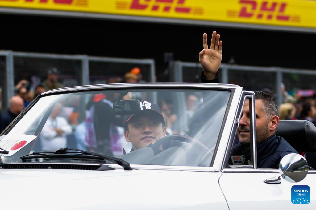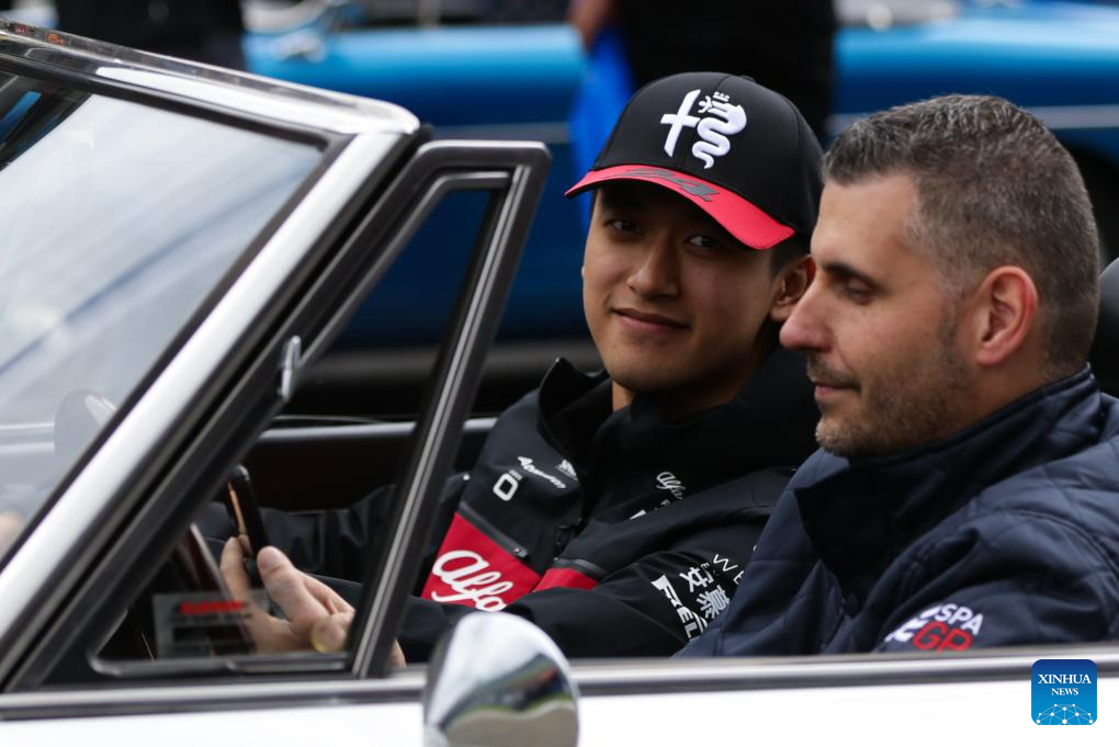 Alfa Romeo's Chinese driver Zhou Guanyu (L) reacts during a parade before the Race of the Formula 1 Belgian Grand Prix 2023 at the Circuit of Spa-Francorchamps, Stavelot, Belgium, July 30, 2023. (Xinhua/Zheng Huansong)