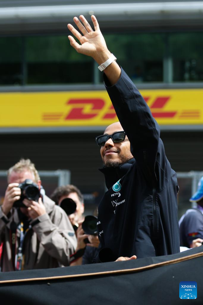 Mercedes' British driver Lewis Hamilton reacts during a parade before the Race of the Formula 1 Belgian Grand Prix 2023 at the Circuit of Spa-Francorchamps, Stavelot, Belgium, July 30, 2023. (Xinhua/Zheng Huansong)