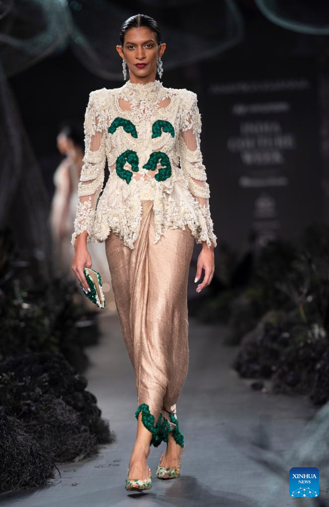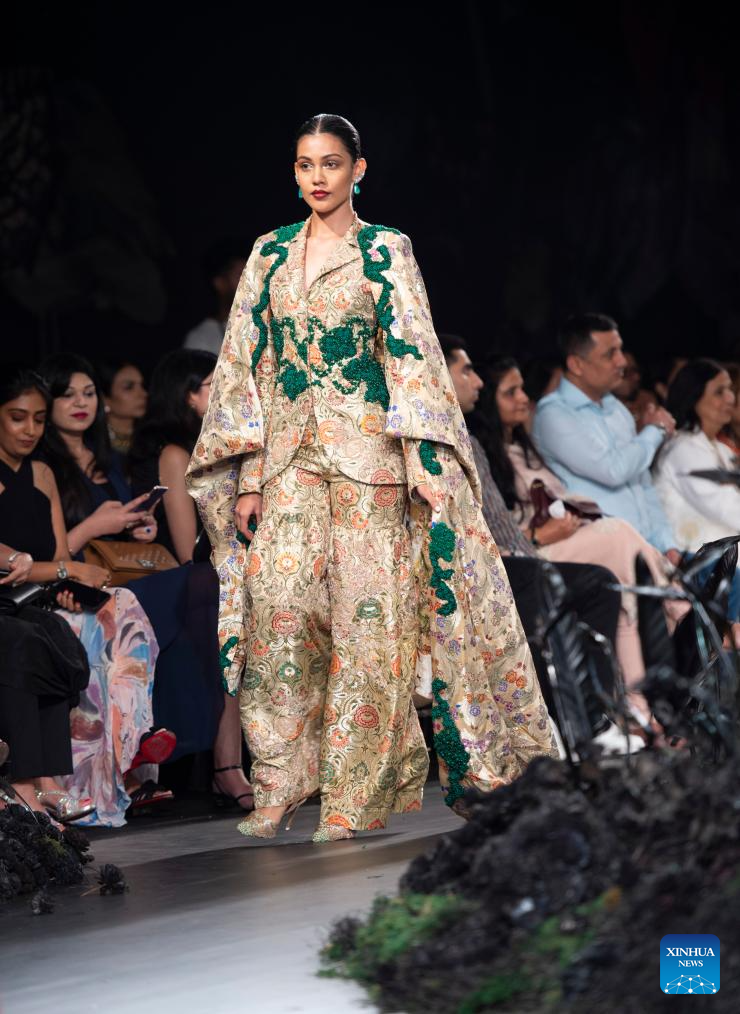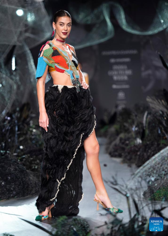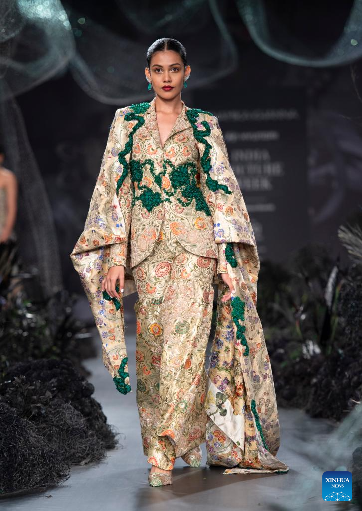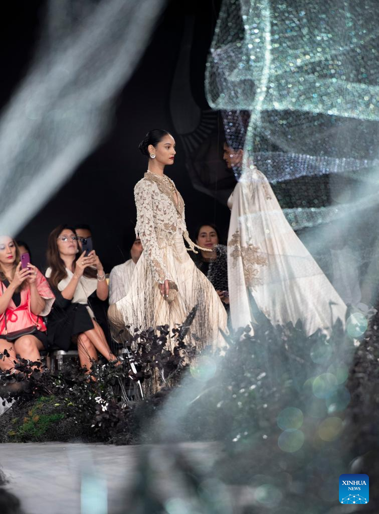 Models display creations by Indian designer Anamika Khanna during the FDCI India Couture Week 2023 in New Delhi, India, July 30, 2023. (Xinhua/Javed Dar)