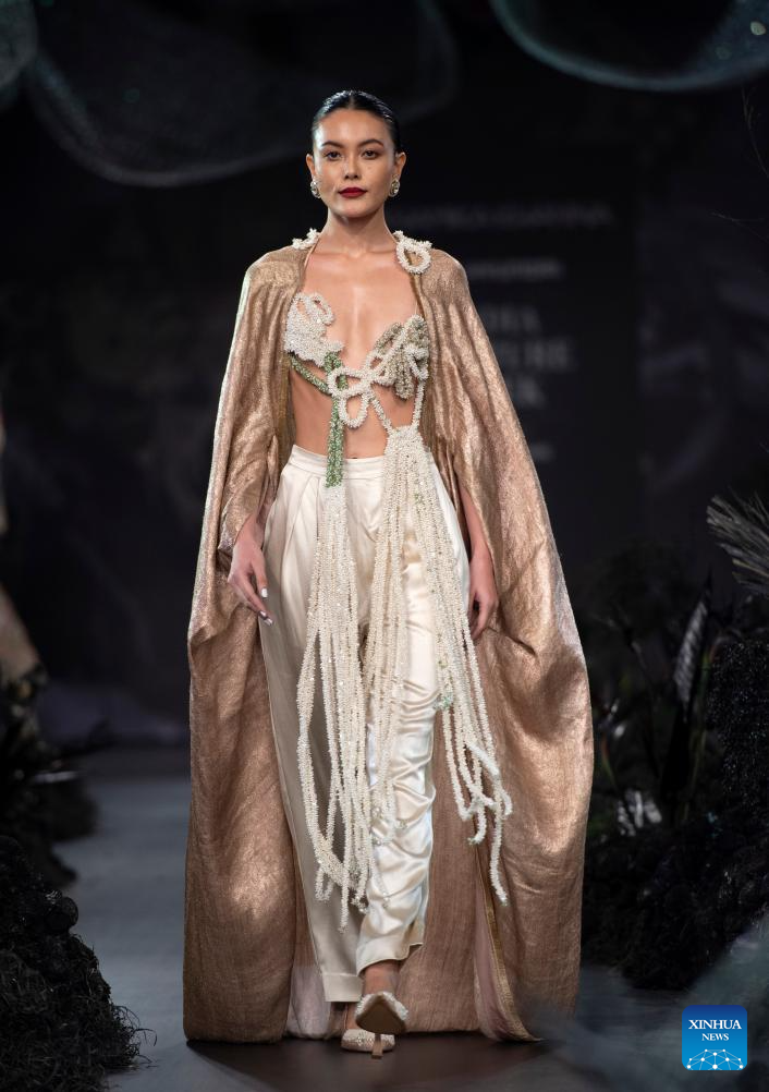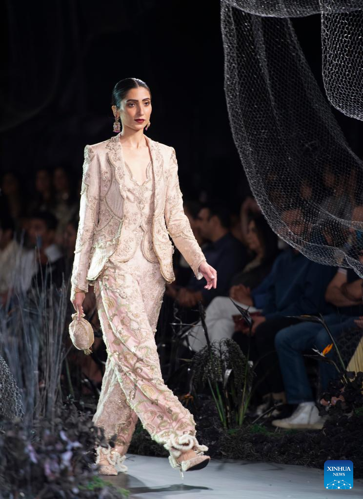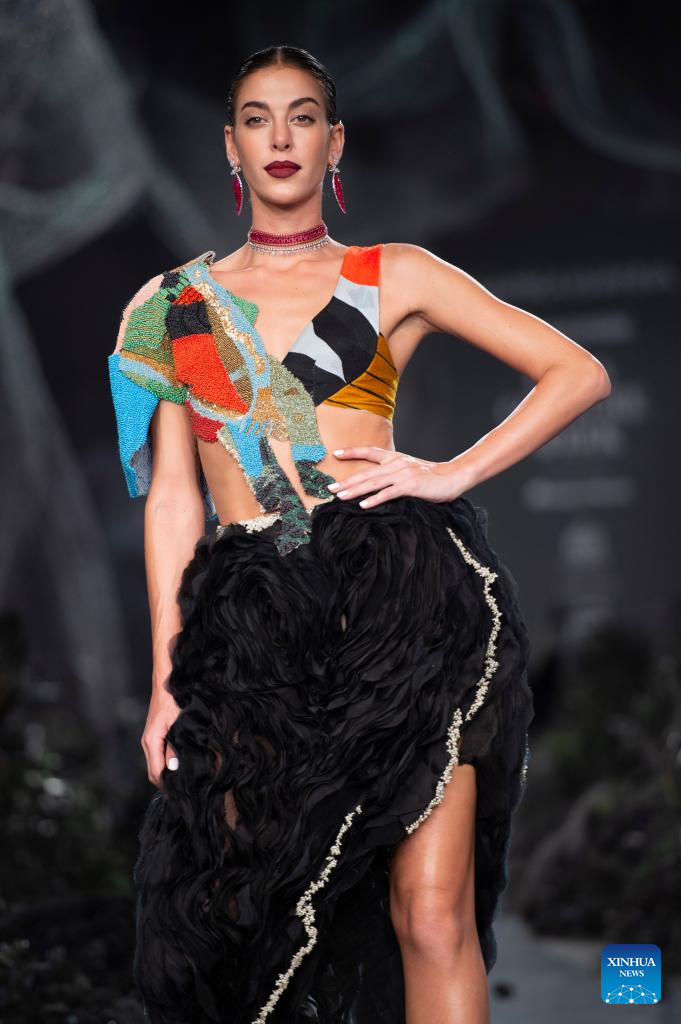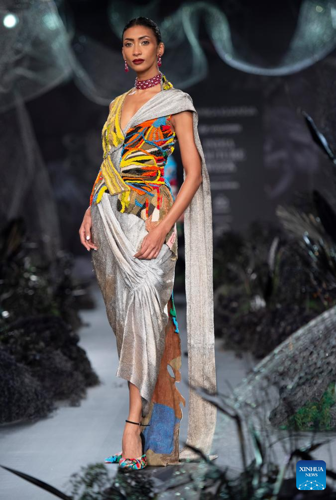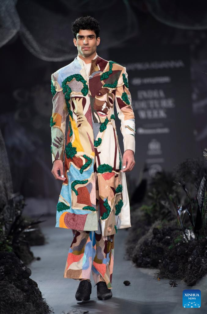 Models display creations by Indian designer Anamika Khanna during the FDCI India Couture Week 2023 in New Delhi, India, July 30, 2023. (Xinhua/Javed Dar)