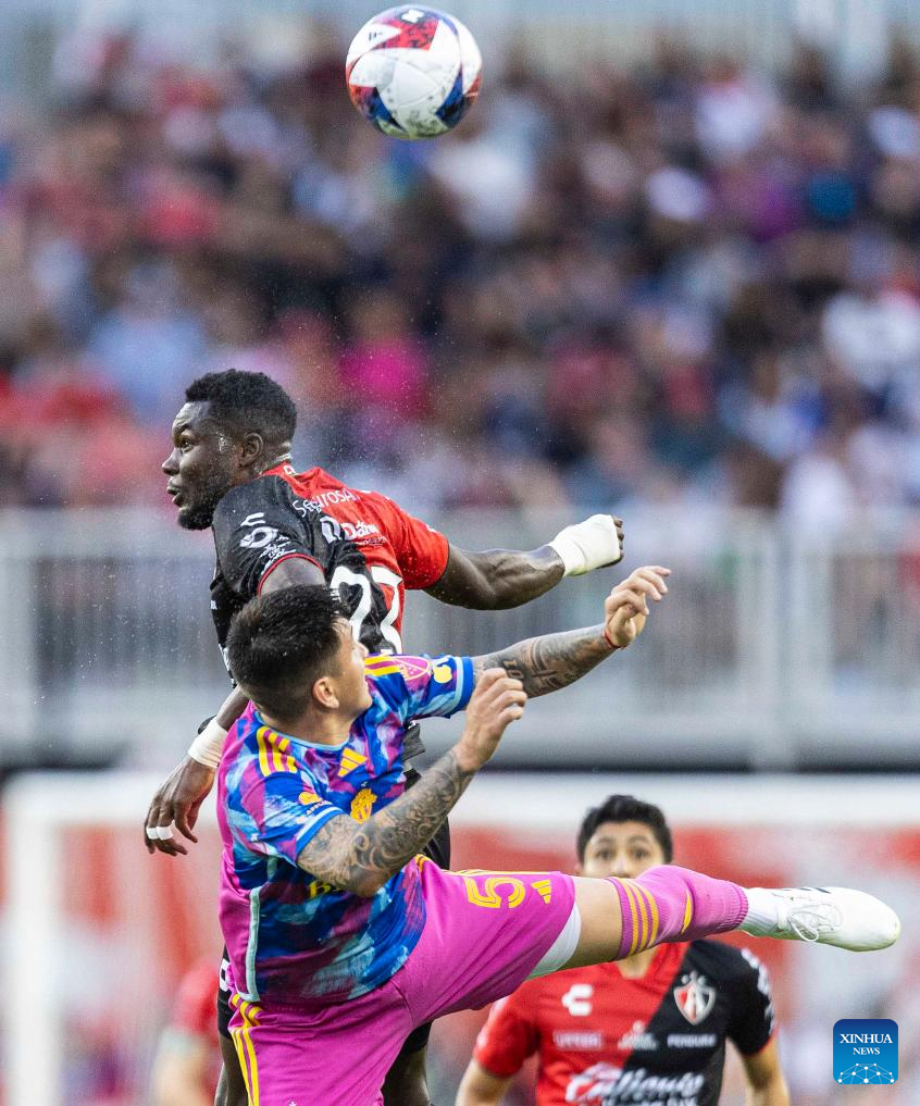 Jordy Josue Caicedo Medina (C, front) of Atlas FC celebrates scoring during the 2023 Leagues Cup match between Toronto FC and Atlas FC at BMO Field in Toronto, Canada, on July 30, 2023. (Photo by Zou Zheng/Xinhua)